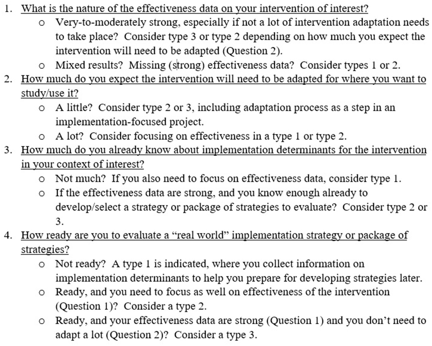 Question 1 focuses on the strength of effectiveness data that exists currently about the intervention of interest. The presence of strong data in support of an intervention's effectiveness indicates a focus on hybrid types 3 or 2, depending on the extent to which the intervention might need to be adapted (not at all, type 3 is indicated; some adaptation, consider type 2; major adaptation, consider type 1). The relative lack of effectiveness data, or mixed data on effectiveness, indicates a focus on hybrid type 1 or 2, depending on how much is known about implementation determinants. Question 2 focuses on the expected degree of adaptation required to permit use of the intervention for use with a new population, context, or behavioral target (15, 16). Little to no adaption necessary combined with solid effectiveness data on the intervention (Question 1) would indicate a focus on hybrid type 3 or 2. A higher degree of required adaptation would indicate types 1 or 2. Question 3 focuses on current knowledge about the implementation context. If little is known about potential determinants of implementation of an intervention, and there is a strong need for additional effectiveness data (Question 1), a hybrid type 1 is strongly indicated. If enough is known about implementation determinants to be able to select and tailor (17) implementation strategies (see Question 4), a hybrid type 2 or 3 approach is indicated, depending on the existing level of the effectiveness evidence for the intervention (Question 1). Question 4 focuses on readiness to test or evaluate implementation strategies. In the most basic sense, readiness is indicated when investigators have developed or selected the implementation strategies they wish to deploy and evaluate. From an implementation science perspective, such readiness is optimized when implementation strategies have been developed in partnership with relevant key partners (18, 19) and matched to known implementation determinants (20–22). Further, the extent of evidence supporting the use of specific implementation strategies should also be considered. Readiness is subjective, however: the decision to move forward with an evaluation of implementation strategies can be influenced by many factors, including stakeholder input, system needs, and contextual influences (e.g., health emergencies). From the standpoint of selecting a hybrid study type, the decision to evaluate strategies (and therefore “ready”) is the key factor, regardless of how the strategies were selected/developed or how the decision itself was made.