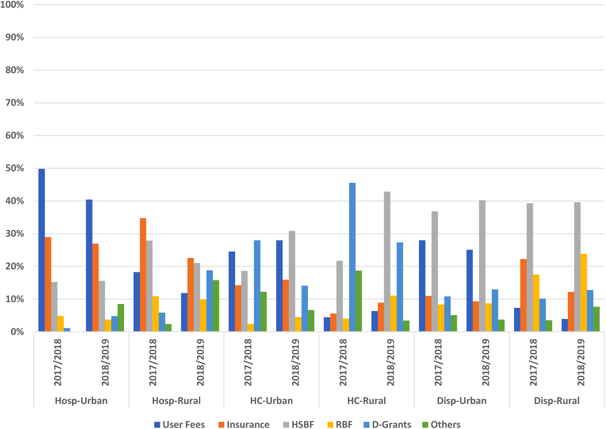 The sources of revenue reported included user fees, insurance, health sector basket funds (HSBF), results-based financing, development grants, and others. In urban hospitals and health centers, user fees have for both years predominantly represented the highest percentage of the total facility revenue (range 26%–45%), while in other facility levels, HSBF predominated, taking up more than a quarter share to the total facility revenue.