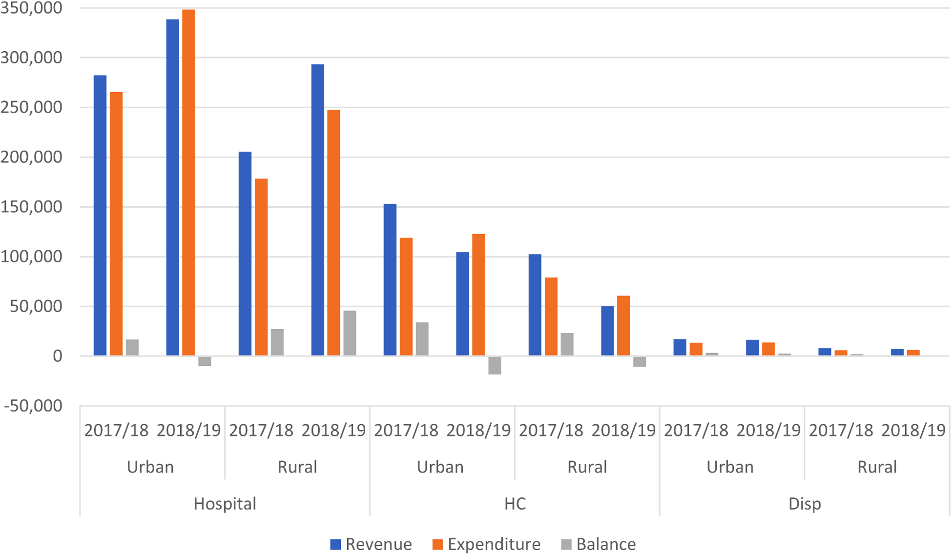 Comparing revenue to expenditure, most of the revenues were almost fully expended with a few exceptions noted in 2018–2019, when rural hospitals and health centers—both urban and rural—expended more than their revenue (Figure 2).