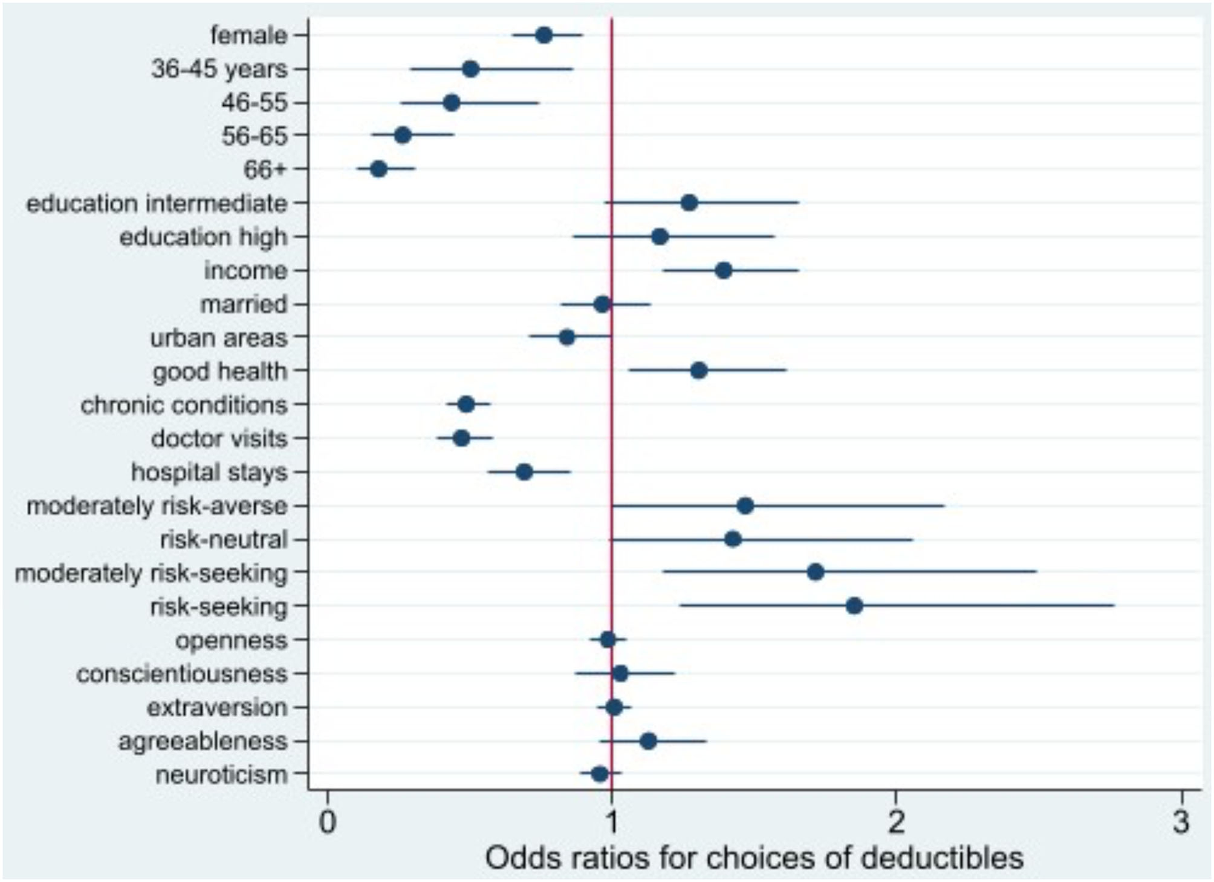 Figure 1. Odds ratio plot for choice of voluntary deductibles. Swiss Household Panel (SHP), own calculations. The figure shows the odds ratios from logistic regression models for the choice of voluntary deductibles, including 95% confidence intervals.