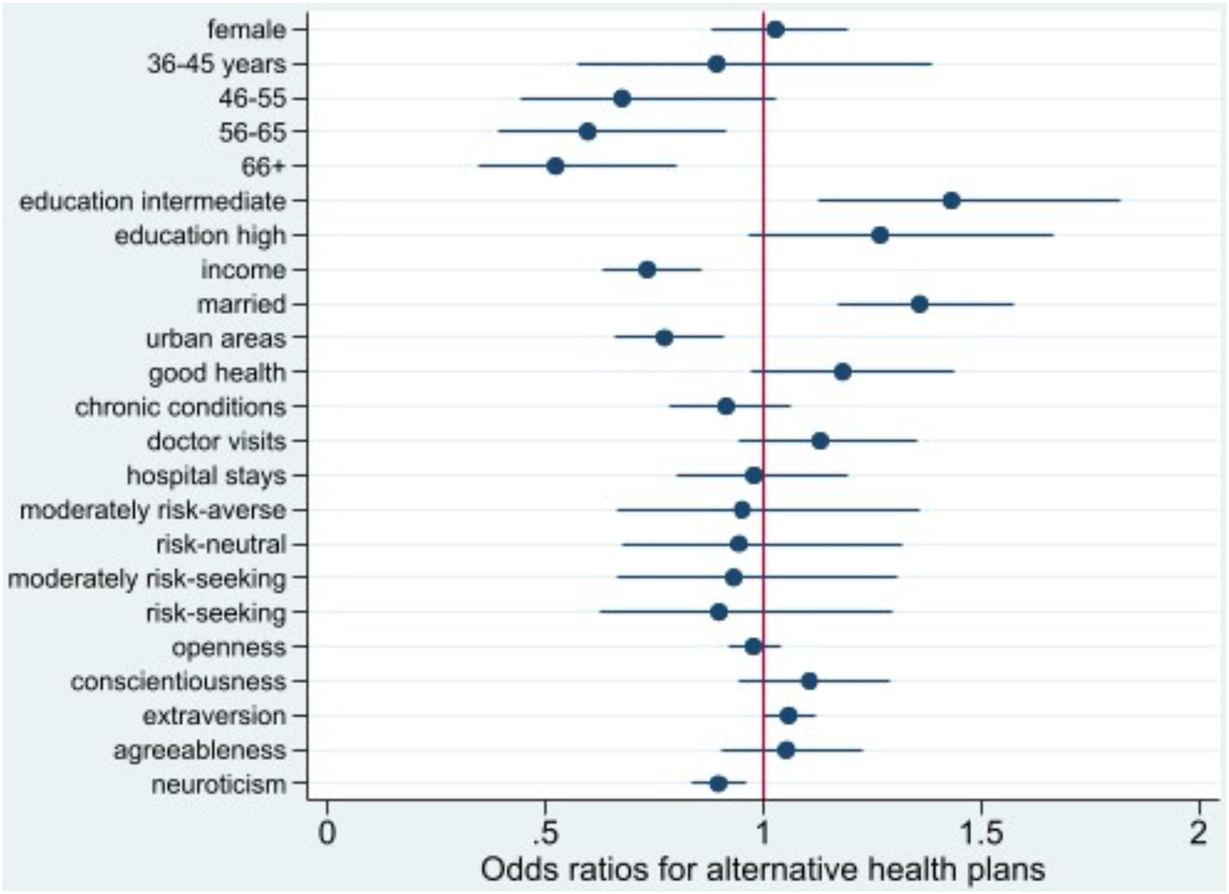 Figure 2. Odds ratio plot for choice of alternative health plans. Swiss Household Panel (SHP), own calculations. The figure shows the odds ratios from logistic regression models for the choice of an alternative health plan, including 95% confidence intervals.