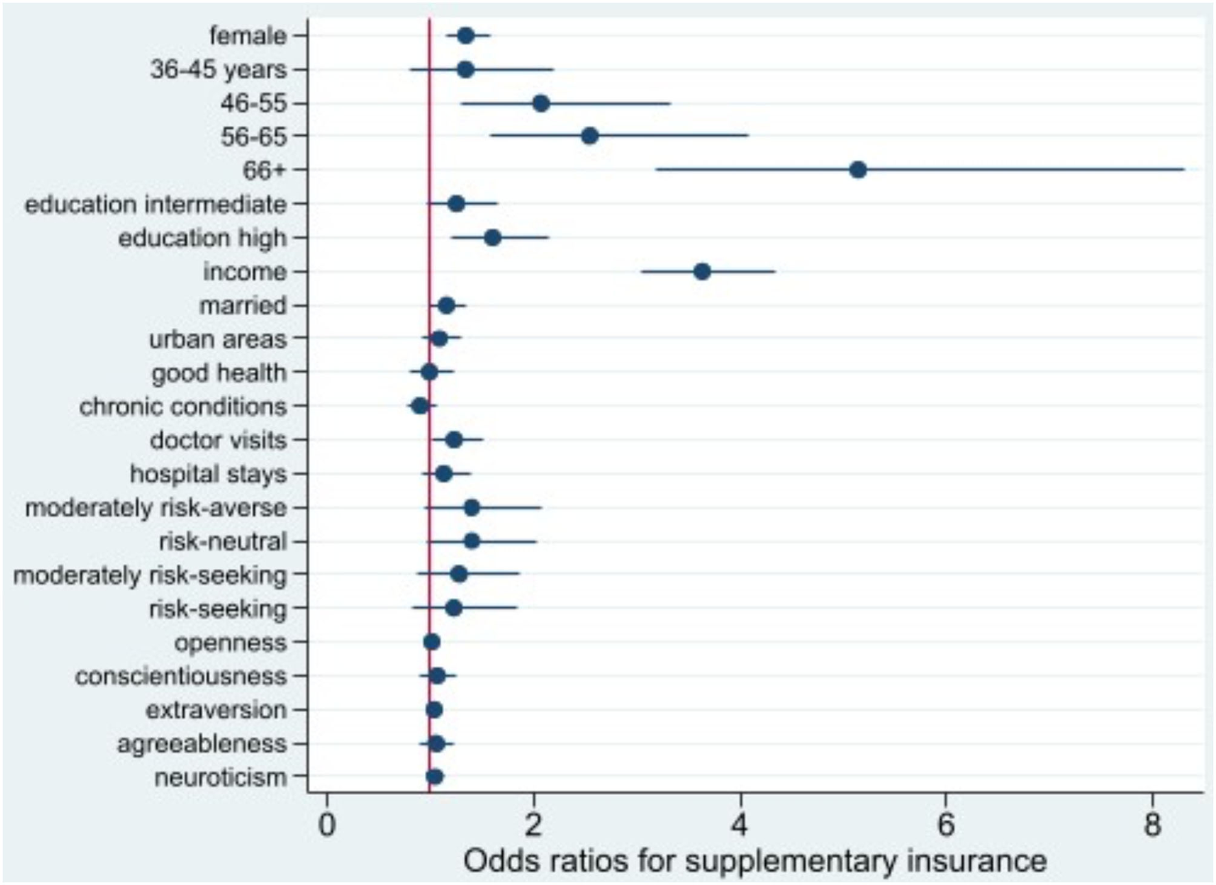 Figure 3. Odds ratio plot for choice of supplementary hospital insurance. Swiss Household Panel (SHP), own calculations. The figure shows the odds ratios from logistic regression models for the choice of supplementary hospital insurance, including 95% confidence intervals.