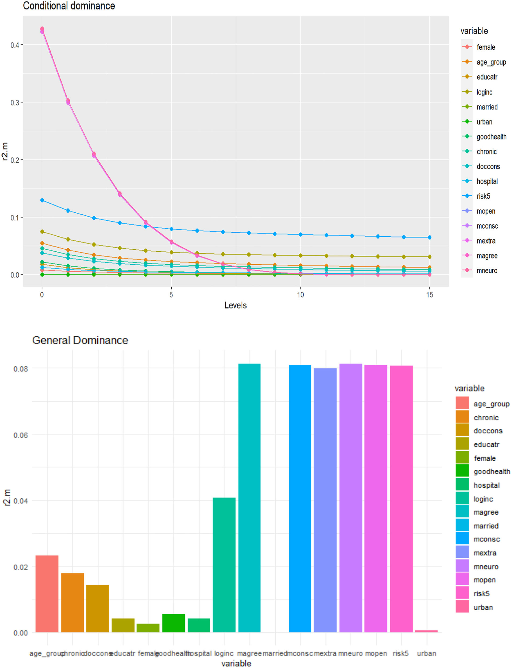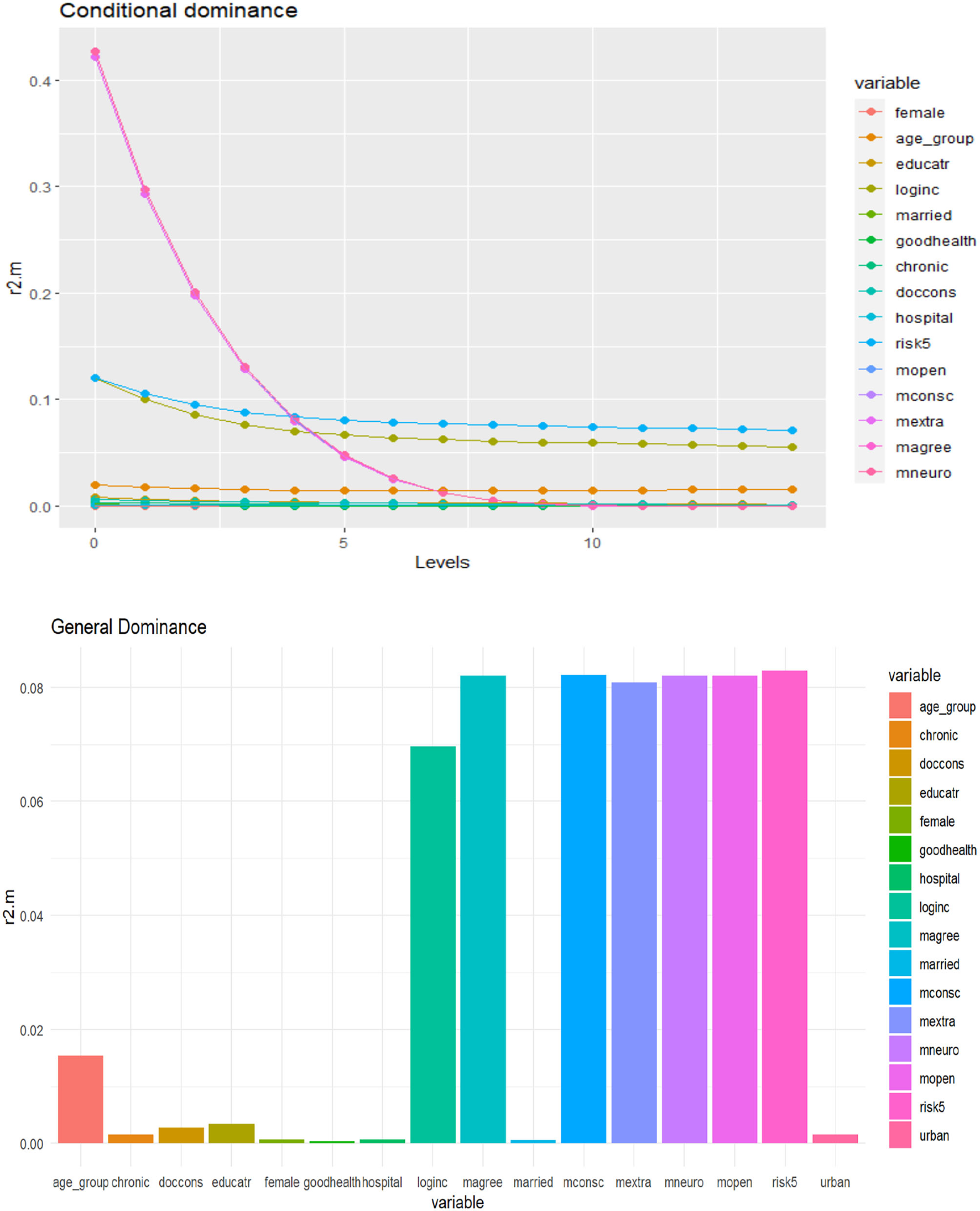 Figure 6. Conditional and general dominance for choice of supplementary hospital insurance. Swiss Household Panel (SHP), own calculations. The figure shows the contributions of predictors by levels (conditional dominance) and the average contribution (general dominance) of the predictors for the choice of supplementary hospital insurance, using McFadden R2 as the analog of R2. Conditional dominance statistics and general dominance statistics are displayed on the vertical axes. High values correspond to high levels of contributions, thus being more dominant across all model sizes [for more information, see (41)].