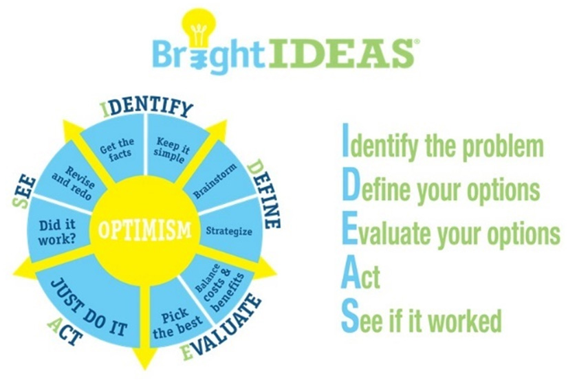 The Bright IDEAS intervention is designed to empower individuals to manage adverse situations by using constructive coping strategies. It is a five-step cognitive-behavioral intervention based on the theoretical underpinnings of established problem-solving therapy (PST) (5, 7). Bright IDEAS represents a mnemonic (Figure 1). Bright signifies the concept of optimism (i.e., positive problem orientation), which is essential to successful problem-solving. The letters in the word “IDEAS” each stand for one of the five steps in the problem-solving process: I (Identify the problem), D (Define possible options), E (Evaluate your options—pros and cons of each option), A (Act—create an action plan based on D and E and do it), and S (See if it worked). If the plan did not work, review the options and devise a Plan B.