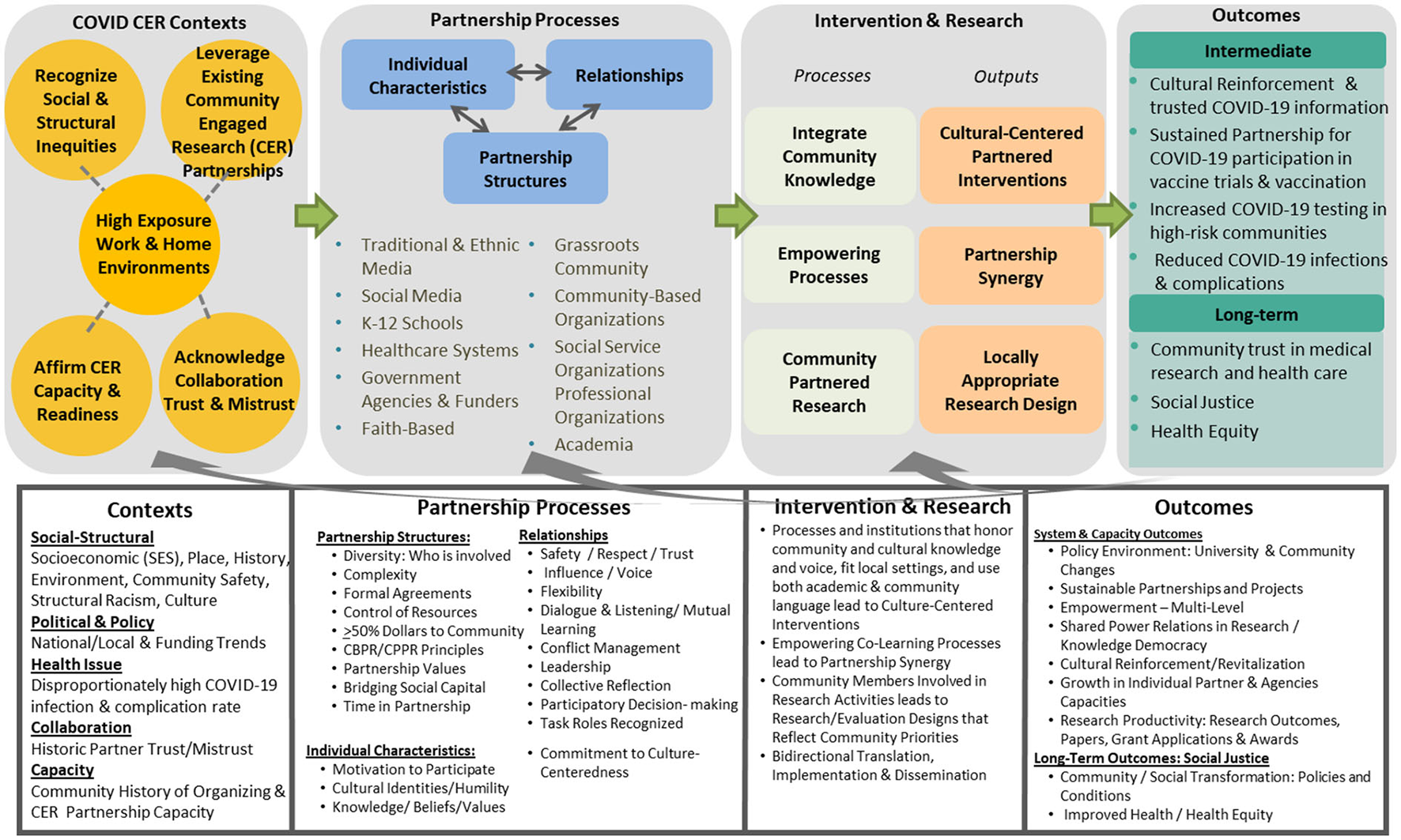 The California state-based NIH CEAL consortium—the Share, Trust, Organize, Partner: the COVID-19 California Alliance (STOP COVID-19 CA)—was designed to promote COVID-19 research, clinical practice, and public health equity for the California communities hardest hit by the pandemic. The Alliance's aims were to (a) understand current community knowledge, and resource needs, (b) support recruitment into COVID-19 vaccine and therapeutic trials, and (c) develop evidence-based interventions to address COVID-19 disparities. The Alliance was guided by principles and strategies from Wallerstein's community engagement conceptual framework (35, 36), adapted to the COVID-19 pandemic (Figure 1). The model emphasizes important dynamics and outcomes in community-engaged research (CER): contextual and cultural centeredness, appropriate recruitment and retention strategies, and strengthened community. These also include partnering with community members to best contextualize an intervention for specific settings, integrating cultural values and practices to enhance sustainability when grant funding ends, and ultimately, democratizing science by valuing communities as equal contributors to the knowledge production process.