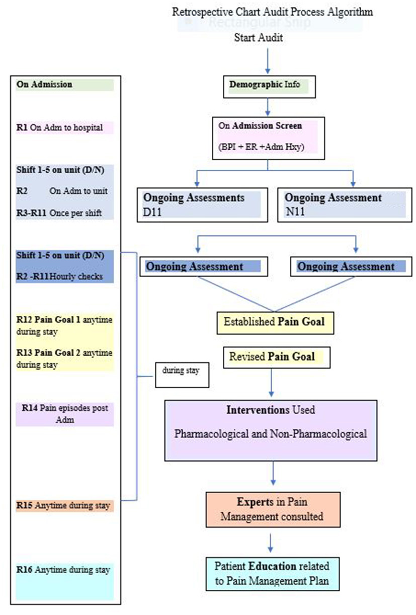 Organizational leaders purposefully selected two Medicine care units as “critical sub-cases” (41) among the existing five Medicine units. Subcase selection was based on maximum variation, managers' willingness to participate, biannual prevalence results, site uniqueness, and representation from different campuses. In early 2019, we conducted the chart audits for the selected subcases. We audited 100 randomly selected “unique” inpatient charts, for each subcase (total n = 200) to verify subcase nurses' adherence to five Pain P/P recommendations at the 10-year timeframe. We used the following audit dates, which were outside holiday periods, and proceeded established audit survey processes: August to October 2016, January to March 2017, and July to October 2017. The following audit tools were used: (i) process algorithm (see Figure 1), (ii) a coding dictionary, and (iii) an excel data extraction spreadsheet based on recommendation measures. Audit tools were subject to “face validity” testing (45) by two site representatives and one knowledge user (i.e., previous employee at study site) on the research team, then piloted. Two reviewers independently assessed the “reliability” of the extraction tool for 15 records (45) with minimal modifications to expand two data categories: patient admission diagnoses, alternative therapies used. For each recommendation, we specified inclusion criteria and sources. To maintain measurement consistency, we used the “first shift on the unit” as a measure of “on admission,” and the “next five consecutive shifts” as a measure for “ongoing assessments” (during patient stay). Post audit, an independent reviewer randomly tested extracted data calculations to confirm accuracy.