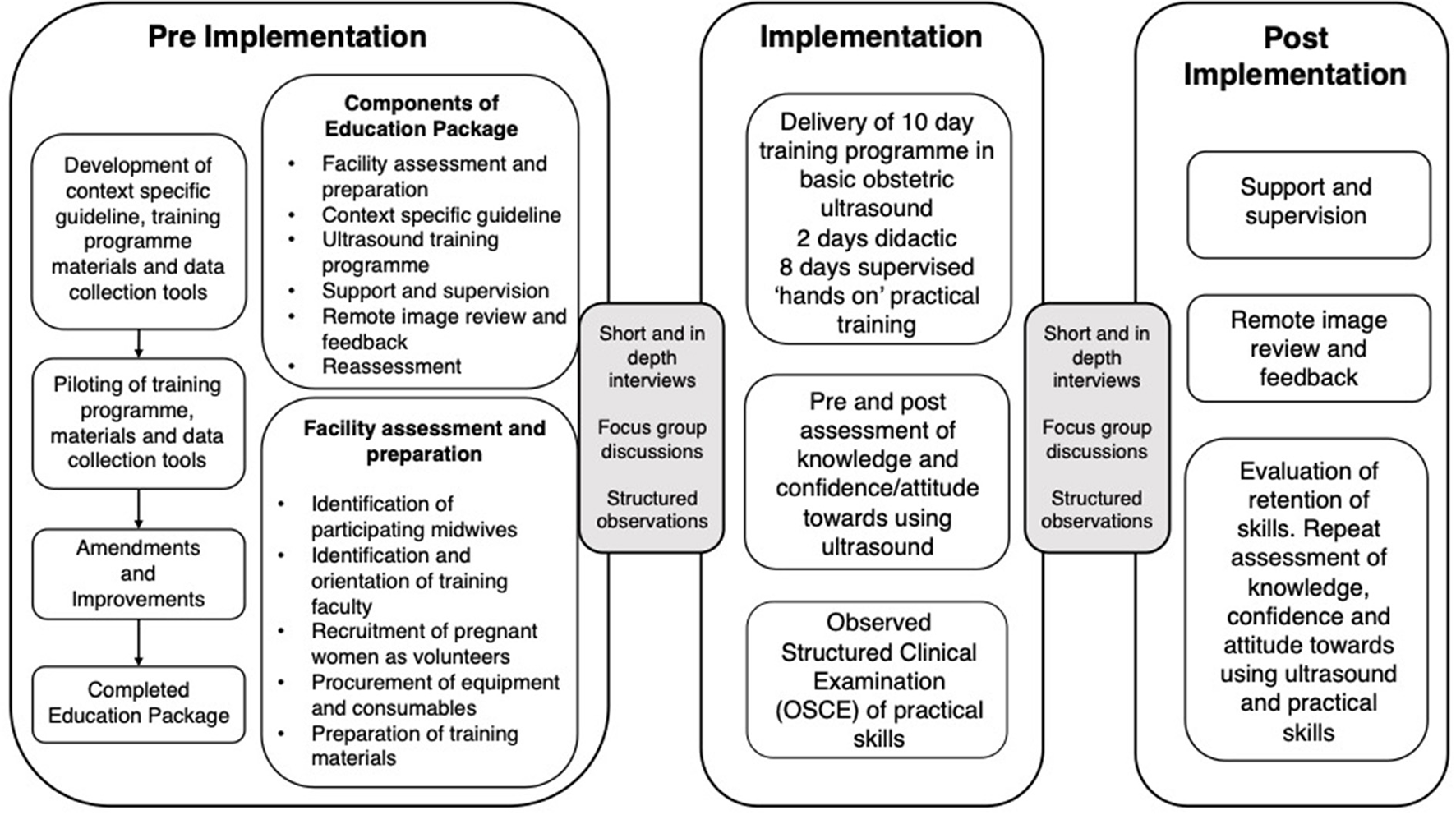 28/29 midwives completed the training, with significant increases in knowledge, confidence and practical skills. Adherence to the education package varied, however many changes to the proposed methodology were adaptive and appeared to facilitate the efficacy of the programme. Unfortunately, despite reporting approval regarding the training itself, satisfaction regarding supervision and follow up was mixed, reflecting the difficulties encountered with providing ongoing in-person and remote support.