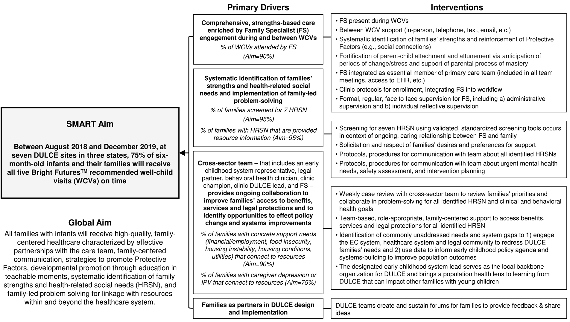 In both phases, DULCE's implementation was guided by the principles and core components of the BTS model. DULCE sites formed teams of direct service providers and stakeholders that included the Family Specialist, early childhood system representative, legal partner, clinic administrator, and pediatric and behavioral health clinicians. Teams committed to pursue one shared, specific aim (75% of 6-month-old infants and their families receive all five recommended WCVs on-time) during a defined period of time (19 months in phase one, 17 months in phase two).