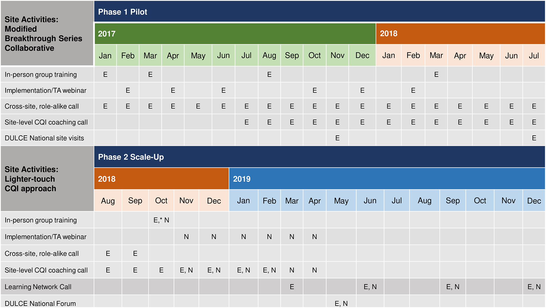 Comparison of CQI support during phases 1 & 2 of DULCE scale-up: established sites (“E”) and new sites (“N”) underwent different levels of CQI intensity when first implementing DULCE.