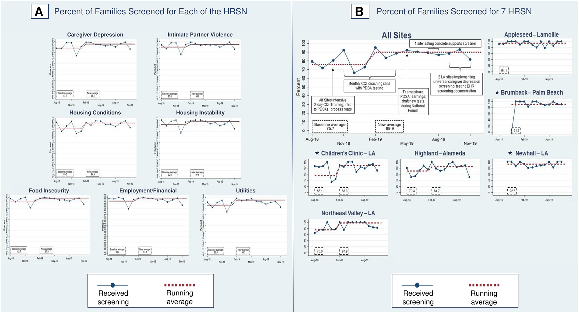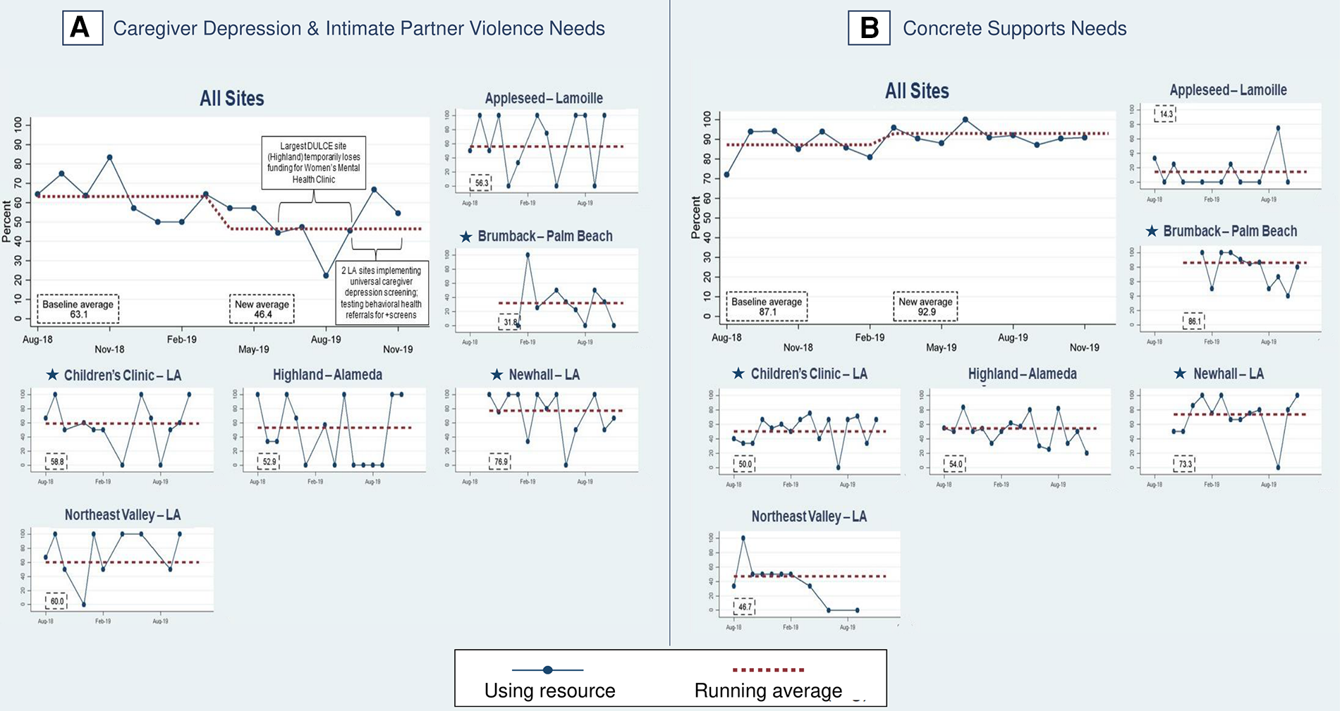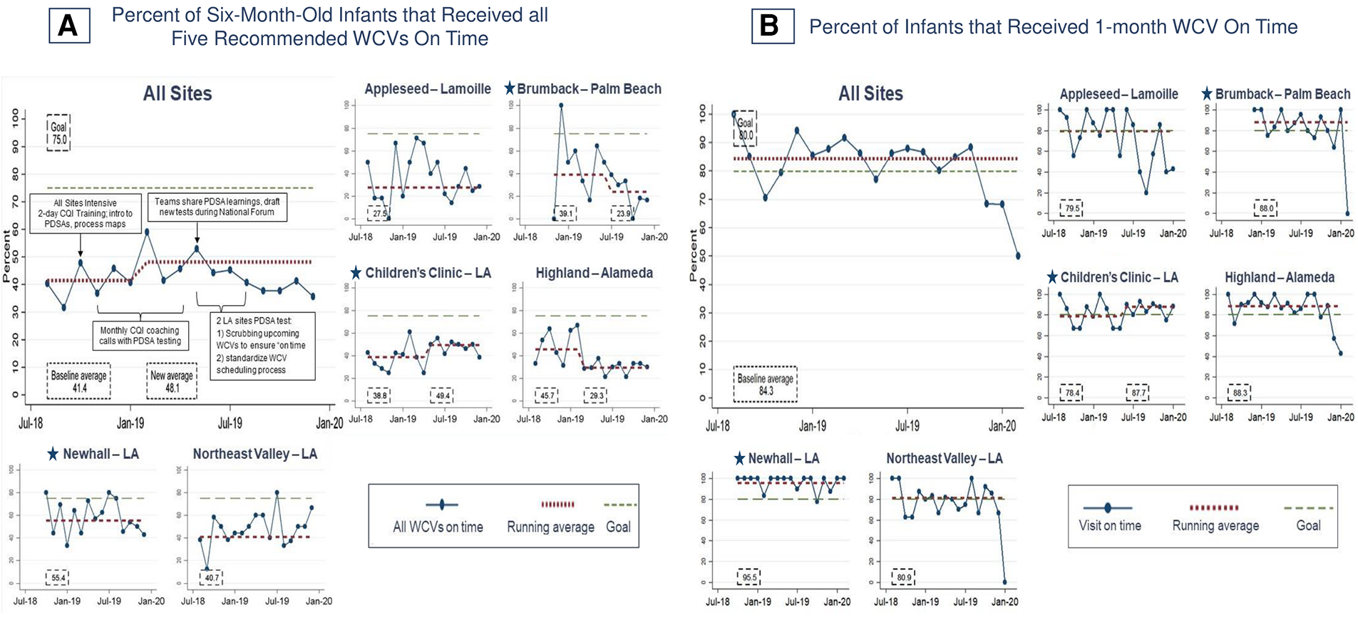 Between August 2018 and December 2019, seven teams in four communities in three states implemented DULCE: four teams that had been implementing DULCE since 2016 and three new teams. Teams received monthly data reports and individualized continuous quality improvement (CQI) coaching for six months, followed by lighter-touch support via quarterly group calls (peer-to-peer learning and coaching). Run charts were used to study outcome (percent of infants that received all WCVs on time) and process measures (percent of families screened for HRSN and connected to resources).