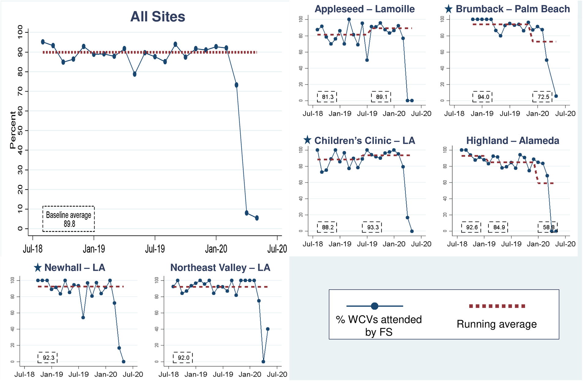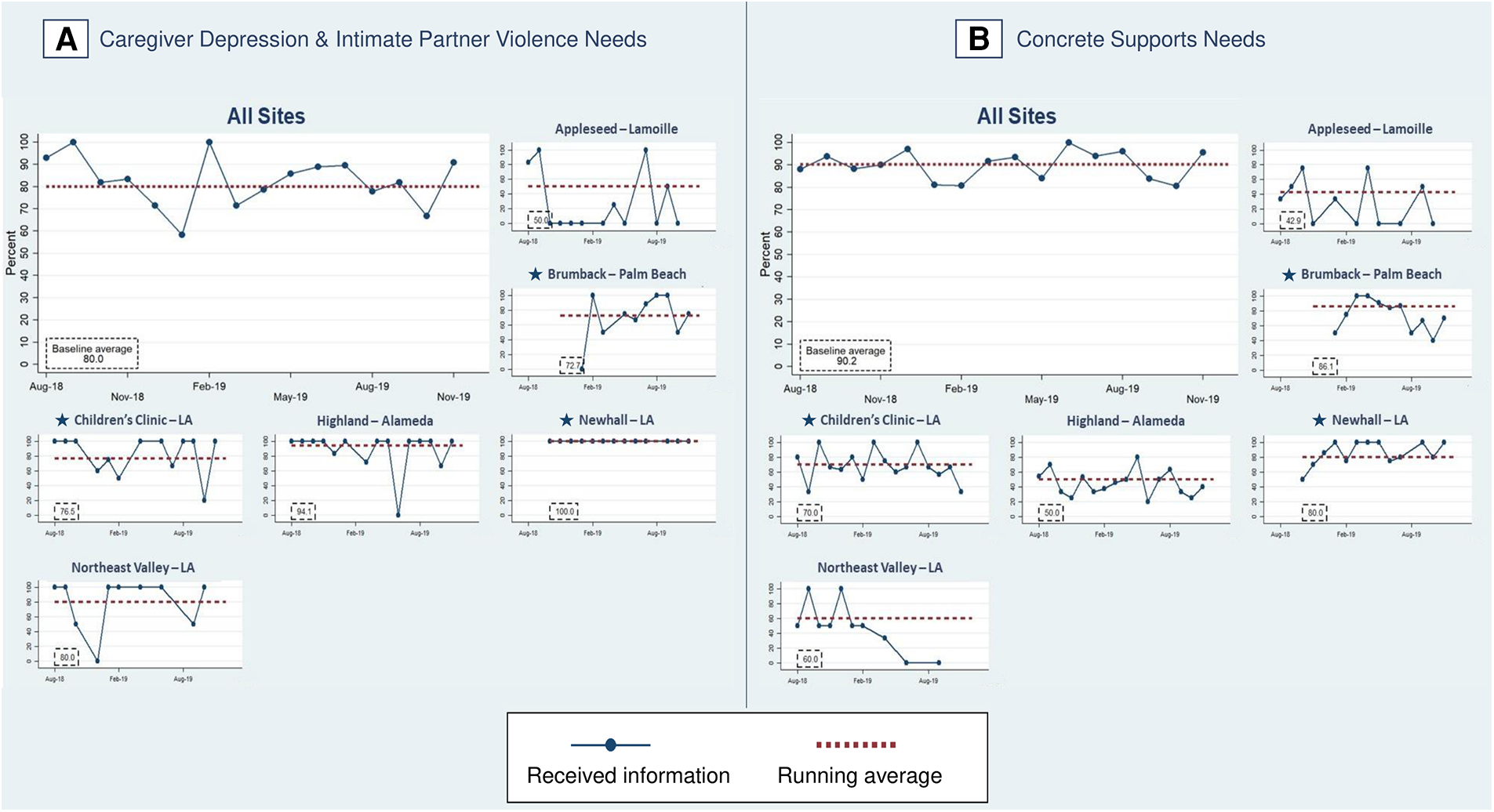 Families' data was aggregated to the clinic site where they received care, except for the Children's Clinic–Los Angeles (LA) sites [Central Long Beach Family Health Center, S. Mark Taper Foundation Health Center (SMTF)], whose data was reported together. As a result, there are data from one mixed new-established site (Children's Clinic–LA), two new sites (Newhall–LA and Brumback–Palm Beach), and three established sites (Appleseed–Lamoille, Highland–Alameda, Northeast Valley–LA).