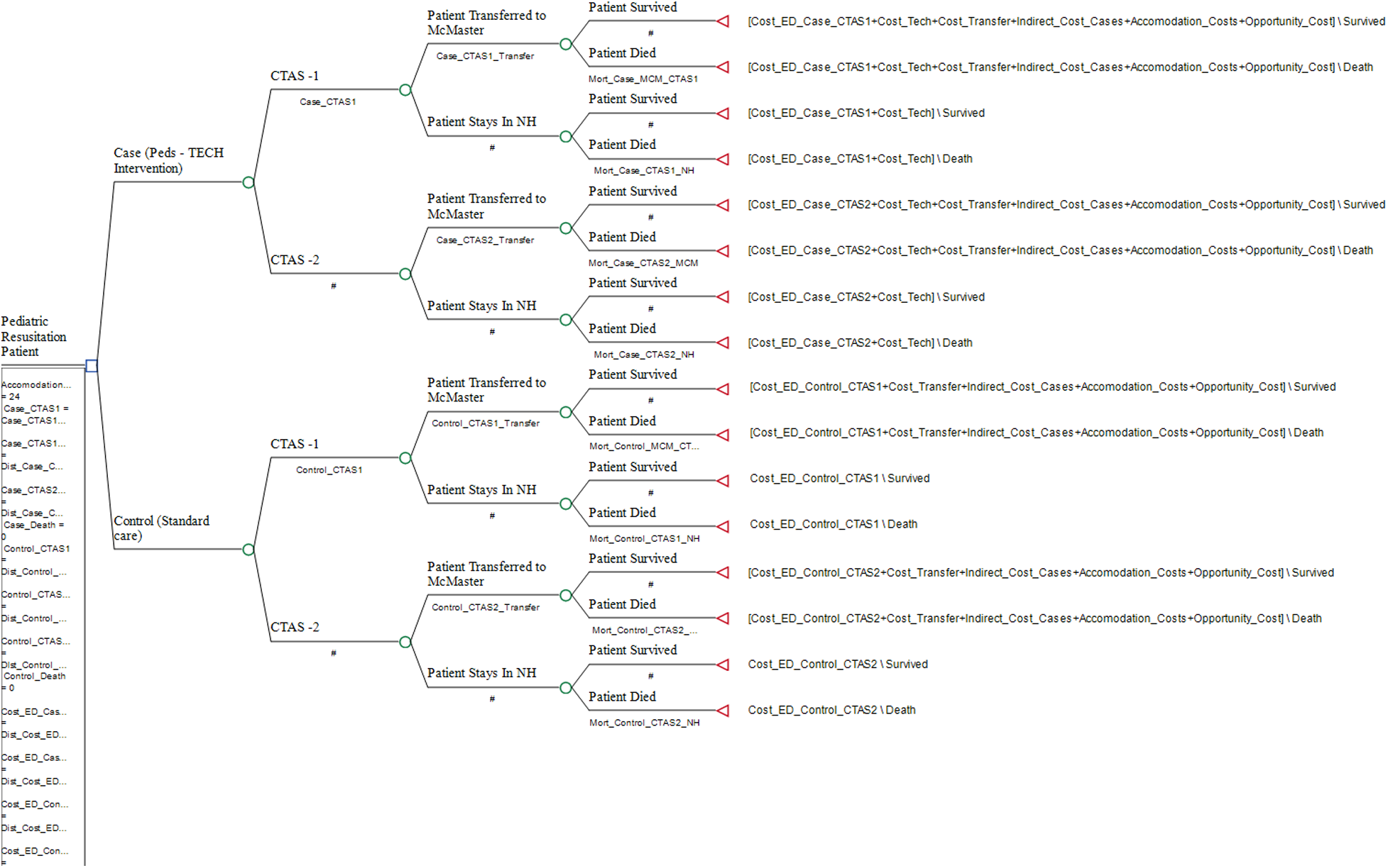 The goal of Peds-TECH is to enhance pediatric outcomes for infants and children who present to Niagara Health (NH) hospitals' emergency departments. This intervention is used only in the most severe cases where receiving physicians/nurses believe they require assistance from pediatric specialists at the tertiary hospital. The Peds-TECH technology enables clinical experts to communicate with the care team via videoconferencing, providing guidance on best practices for resuscitation situation. Due to the severe nature of the call for Peds-TECH, clinical judgment is required to activate the intervention in a timely manner. The intervention's primary goal is to stabilize the patient before transfer to a tertiary hospital. This study included EDs of five community hospitals in the Niagara Region, which served as the entry point for patients. Following entry, pediatric patients were classified as CTAS-1 or CTAS-2. CTAS-1 refers to patients with the most urgent and life-threatening conditions who require immediate attention, while CTAS-2 refers to patients with conditions that are potentially life-threatening and require rapid assessment and treatment. Therefore, if patients are <18 years, triaged as CTAS 1 or 2, and clinical judgement is used to trigger the call for Peds-TECH, patients are eligible for the intervention. At the time of this study, 54 patients had been treated using this technology. At present, there is a knowledge gap regarding the economic impact of the Peds-TECH intervention. As well, additional hospitals in surrounding areas have expressed interest in the Peds-TECH intervention. Therefore, it was crucial to evaluate the costs and cost-effectiveness of the intervention to inform decisions on resource allocation for further spread in the Niagara region and the province of Ontario at large. This study aimed to assess societal costs and cost-effectiveness of the intervention including (i) the out-of-pocket (OOP) costs and time/productivity gains/losses for parents of children seeking care at the community hospital EDs, (ii) costs associated with the health resource utilization (HRU) at the health facility, and (iii) the Peds–TECH technology and program implementation costs. The time horizon of our study was three years, enabling us to capture short-term costs and health outcomes associated with the Peds-TECH intervention and provide evidence to inform resource allocation decisions for its further implementation in the Niagara Region and beyond (10).