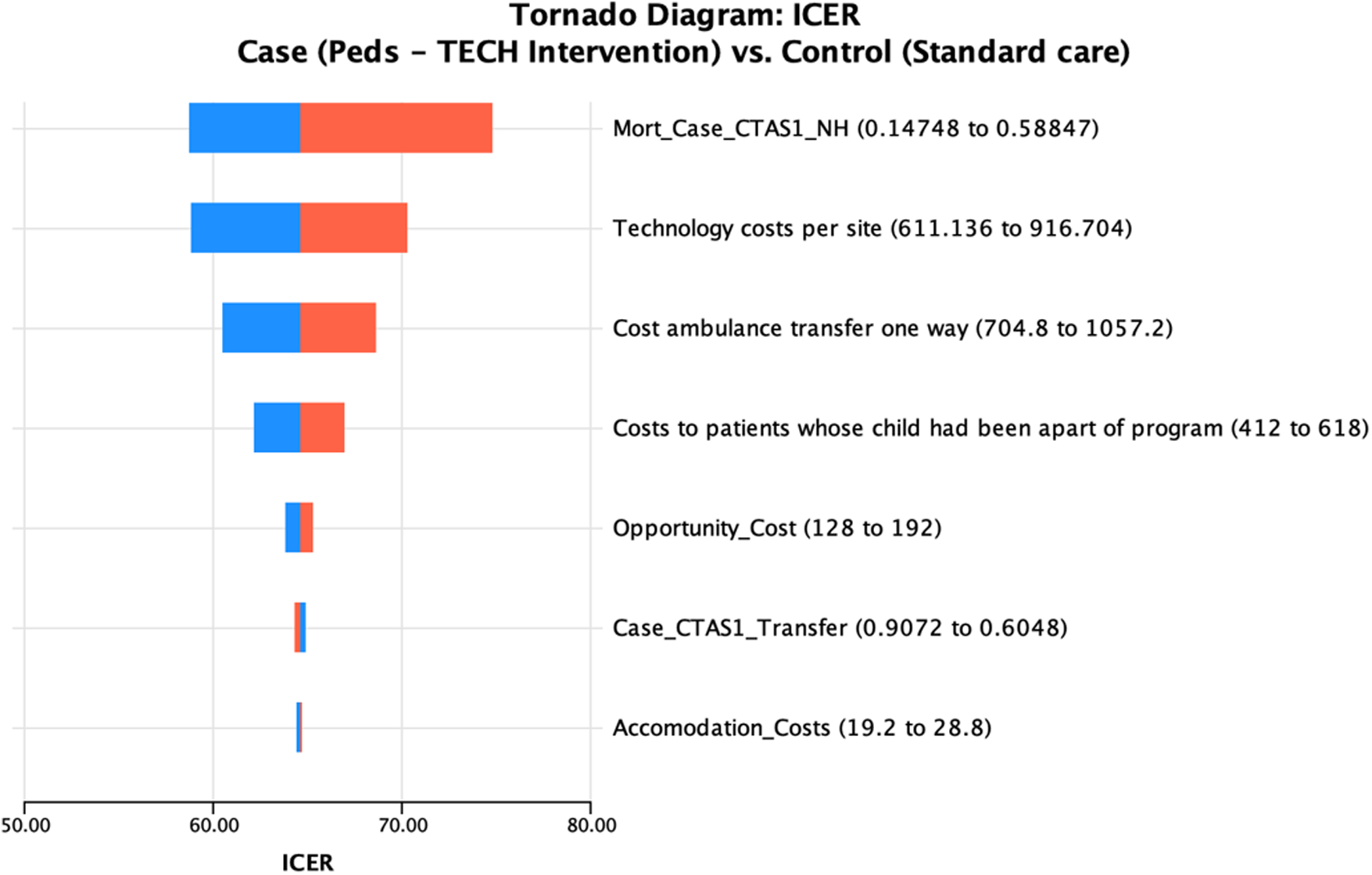 This economic analysis albeit yielded lower ICERs, there was considerable parameter uncertainty observed in the mortality estimates. We found no statistically significant difference in reduction of mortality between the two groups of the study. Despite the odds ratio for mortality being protective among cases (0.498), the CI intervals (the upper and lower bounds) were wide. This could be primarily due to a lower sample size in our study and the fact that mortality is a rare outcome in high-income country settings. Although the statistical p-value for the mortality variable was not favorable, the magnitude (i.e., the effect size) and the direction of the effect indicated positive gains (i.e., life saved). Therefore, the mortality reduction in the intervention relative to the control group highlights the role of physicians and/or nurses in EDs to stabilize patients prior to transfer to a tertiary hospital. Consequently, more patients were treated by specialists upon their arrival, which may have lowered the risk of mortality. Our findings are further corroborated with other studies surrounding outcomes related to TM implementation. Sadaka et al. (21) reported a reduction in ICU mortality during post intervention as well as an overall decreased hospital mortality. Similarly, Breslow et al. (22) found that during their remote ICU period, mortality for their patients was lower and hospital length of stay was shorter. Finally, McCambridge et al. (23) found that overall hospital mortality decreased in their intervention group, compared to the control group. They attributed this to the increased access of specialists and medical staff, provided by the TM program. Overall, the standard of care received by patients treated with the intervention compare favourably to those not treated with the intervention. Although there is a minimal increase in costs, the outcomes of decreased mortality, increased access to specialists, and shorter length of stay make treatment with the intervention more effective. Additionally, the ability of the intervention to help with the stabilization of patients prior to transfer is an important outcome that has potential to reduce mortality in the future.