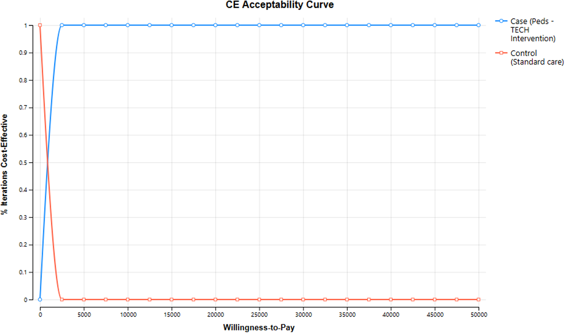 The results of the probabilistic sensitivity analysis (PSA) demonstrate the impact of parameter uncertainty on the incremental cost-effectiveness ratio (ICER), which was estimated to be $64.91 per YLL averted (95% credible interval of −138.72–489.75), highlighting the range of potential ICER values that could arise due to variations in the model inputs.. Therefore, even after 10,000 random samples with a variance range of 20%; the intervention retains cost-effectiveness. This is reflected in Figure 3, where resulting incremental cost-effectiveness scatterplot illustrates that most of the points fell in the northeast quadrant. This indicates that the intervention was both more costly and more effective than the usual care. The scatterplot also indicated some uncertainty in the results, with some simulations showing the intervention to be less effective or more costly than the usual care. However, the overall trend in the scatterplot suggests that the intervention was a cost-effective option for managing pediatric emergencies in the ED setting. Each variable that was included in the PSA and information on their parameter, uncertainty range, and distribution type are reported in Table 5. As well, the probabilistic analysis indicated a 96.1% probability that Peds-TECH is cost-effective under a $5,000 WTP threshold, which is much lower than the standard $50,000 WTP threshold (Figure 4).