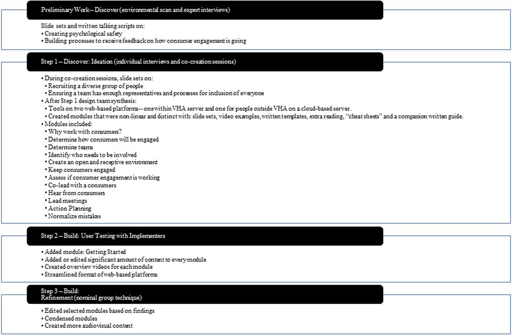 Based on user feedback about content, we added new prototypes and refined existing ones. One new prototype was written guidance and a templated worksheet for implementers to consider and decide how to compensate consumers who help design or deliver implementation strategies. Another prototype was an entirely new module entitled “How to Use Consumer Voice” to address the concern that materials were overwhelming and needed more orientation. Based on user feedback about design principles, we added a real-world example to every module showcasing how to apply a concept, and ensured new prototypes adhered to the above design principles.