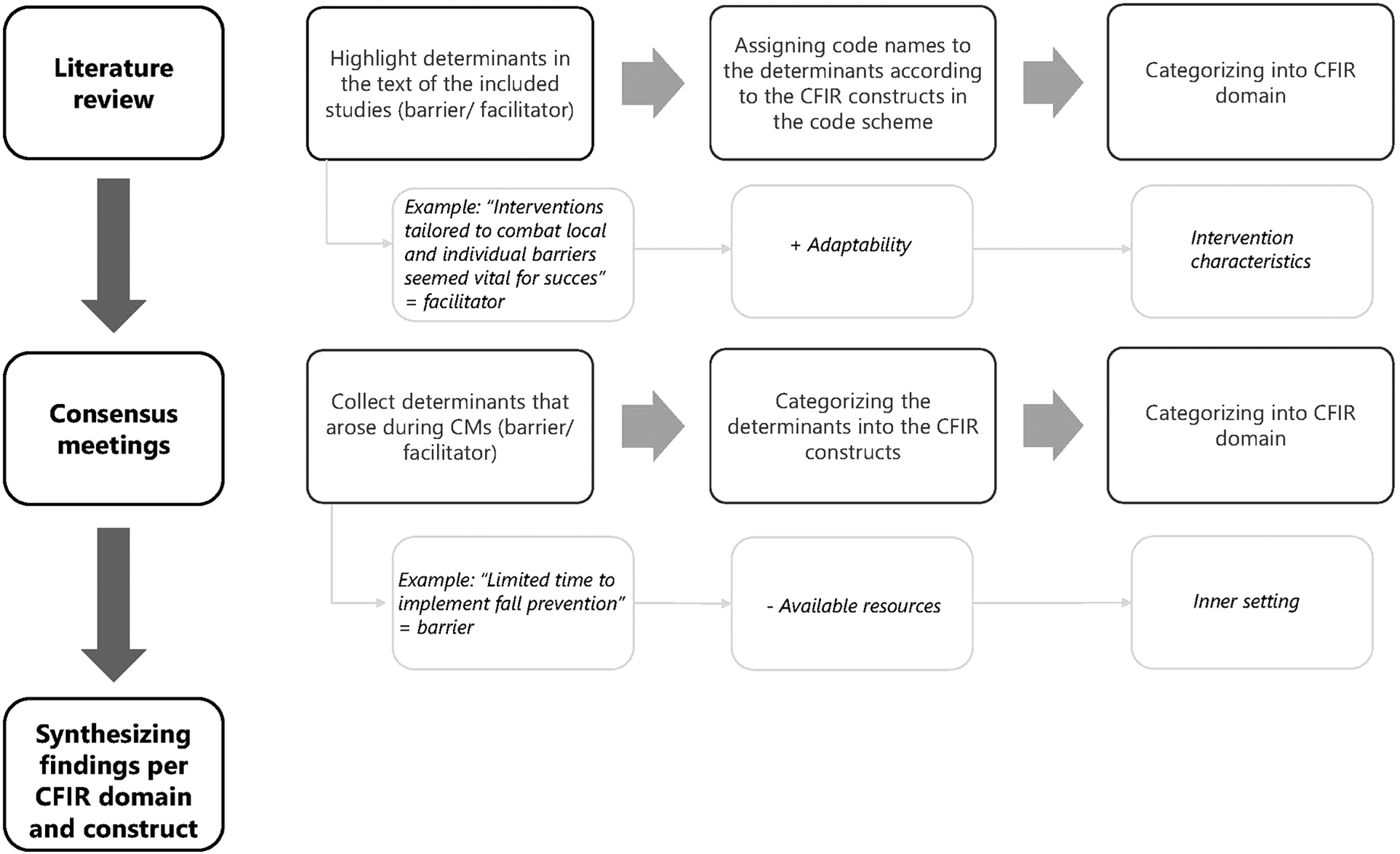 At the start of the session, post-its were handed out to the HSCPs and they were asked to write down barriers and facilitators that influenced the implementation of fall prevention, from their perspective. Then, they placed the post-its into the most suitable PRISM domain on a working sheet. The CMs were conducted in separate meeting areas to ensure privacy. The sessions were facilitated by two researchers who acted as moderators. The CMs were not recorded due to pragmatic challenges that arise with recording focus group discussions (e.g., speaker identification). Also, recording of the CMs did not fit with the purpose of this study, which was to collect barriers and facilitators to implementation rather than to gain a deeper understanding of these determinants. One of the researchers wrote meeting notes of the sessions. Data from the working sheets and meeting notes were also analyzed following a directed qualitative content analysis approach, according to the constructs of CFIR (18). We chose to continue with the CFIR framework at this stage since the PRISM framework lacked clear definitions, guidance and measures to assist in understanding contextual determinants. Conversely, CFIR provides a taxonomy, codebook, and definitions of constructs to facilitate its applicability and usefulness (18, 36). Moreover, the CFIR is based on, among others, elements of the PRISM framework, both drawing on theories of behavior change and improvement science (18, 37), resulting in similar context dimensions across both frameworks (13) and allowing to transfer from PRISM to CFIR. During the last step of the analysis, comparisons between literature and CMs were made and results were combined per CFIR construct and domain.