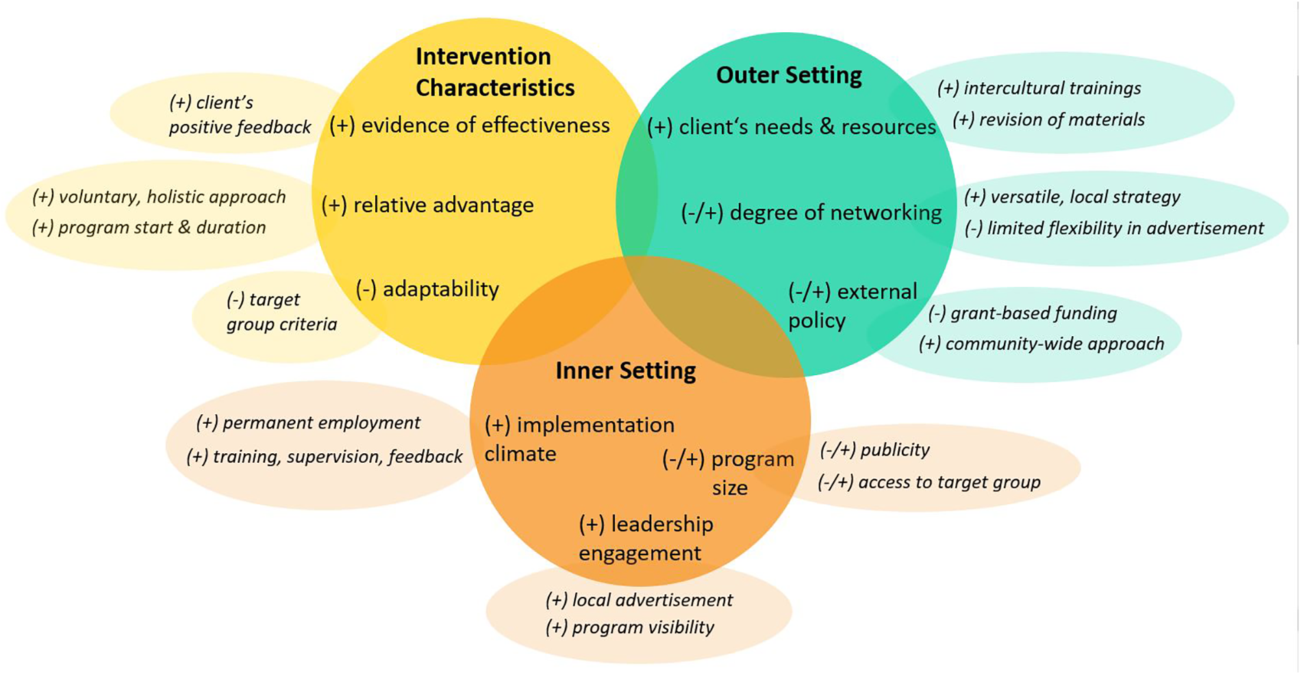 Looking at the intervention characteristics, stakeholders and program implementers viewed the evidence of effectiveness and the relative advantage of the implementation of the program compared to similar interventions as contributors to long-term implementation. However, criticisms pointed to the lack of the program's adaptability as a constraining factor for growth, primarily because of the program's tight target group criteria. Concerning the inner setting, the implementation climate and the leadership engagement were perceived as relevant factors for staff qualification, continuity and the visibility and credibility of the program. In addition, the program's size emerged as an underlying factor that shaped the capacities for intensive networking, activities to increase visibility and access to the target group. Concerning the outer setting, next to the external policy and efforts to meet the clients' needs, the central importance of the degree of networking was highlighted. In particular, the program's relationship with the youth and welfare services emerged as challenging, mainly related to difficult access to families, tensions in communication, and different priorities.