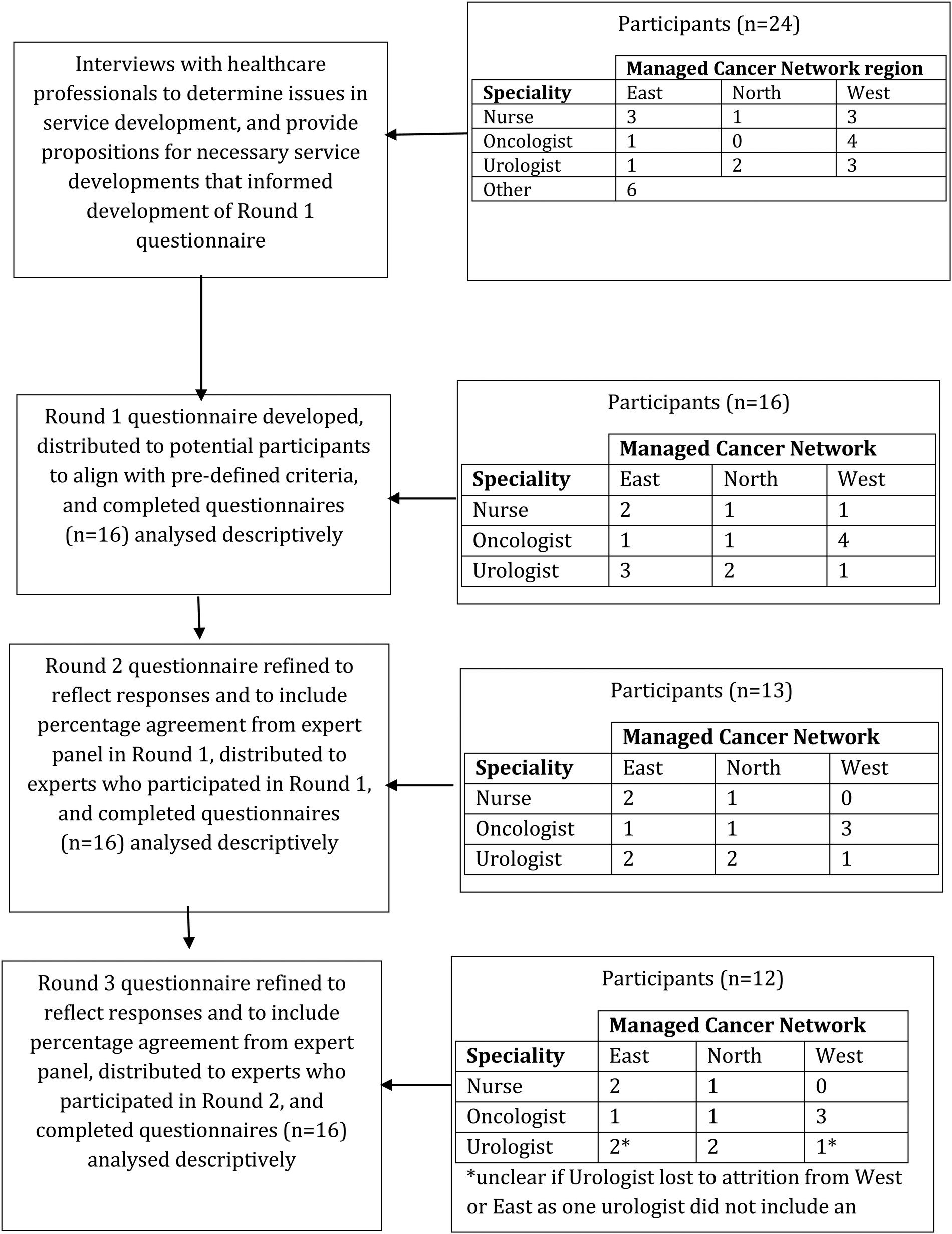 Healthcare professionals were recruited across all MCN regions. Given the focus of questionnaires on service design, recruitment during this phase was limited to specialist nurses, oncologists, and urologists only, to ensure that participants had the relevant expertise needed to complete questionnaires. Participants were invited to interview via email and were encouraged to forward the invite to participate to relevant colleagues.