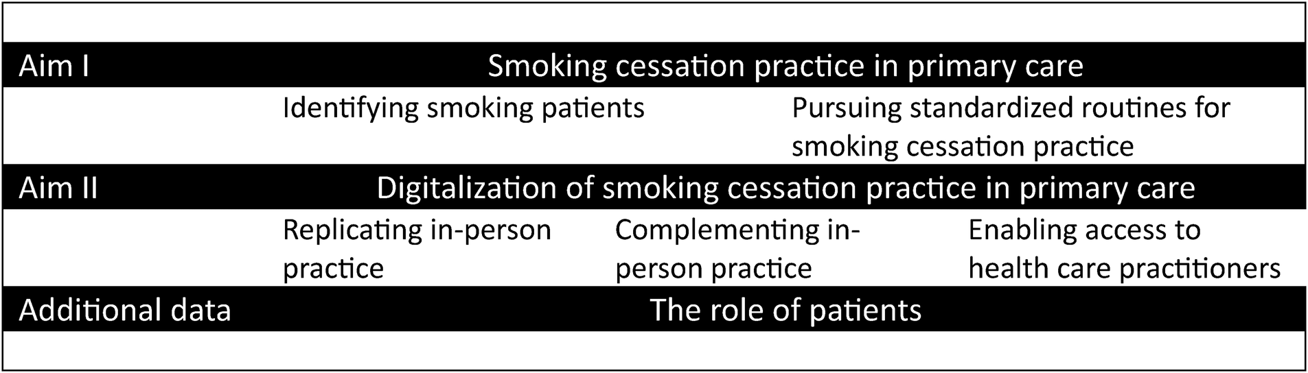 Informants described smoking cessation practice in primary care as (i) identifying smoking patients, (ii) pursuing standardized routines for smoking cessation practice and (iii) keeping smoking cessation practice on the agenda. Digital tools were described by informants to be used in different ways: (i) replicating practice, (ii) complementing practice and (iii) enabling access to health care practitioners. Finally, the analysis showed that patients' expectations and behaviors contributed to how and when smoking cessation practice was conducted, including the use of digital tools.