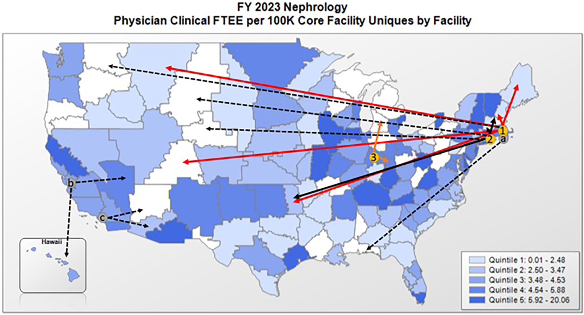 VA-based nephrology services and services provided by the telenephrology EWI. In-person nephrology specialty care is not offered at every VA facility and rural facilities often lack a VA nephrologist or depend on a single provider. The telenephrology EWI currently consists of three telenephrology hub sites in (1) Boston, (2) Connecticut, and (3) Indianapolis that provide services to originating spoke sites (solid lines) in VISN1 (Maine and New Hampshire), VISN10 (Chillicothe, OH), and VISN19 (Muskogee, OK, Grand Junction, CO, and Fort Harrison, MT). (a) A hub in Providence, RI will open in July of FY23 and negotiations are currently underway to expand the EWI in FY24 and FY25 to include west coast hubs in (b) Palo Alto, CA and (c) Long Beach, CA, with an aim to reach additional originating sites (dashed arrows).