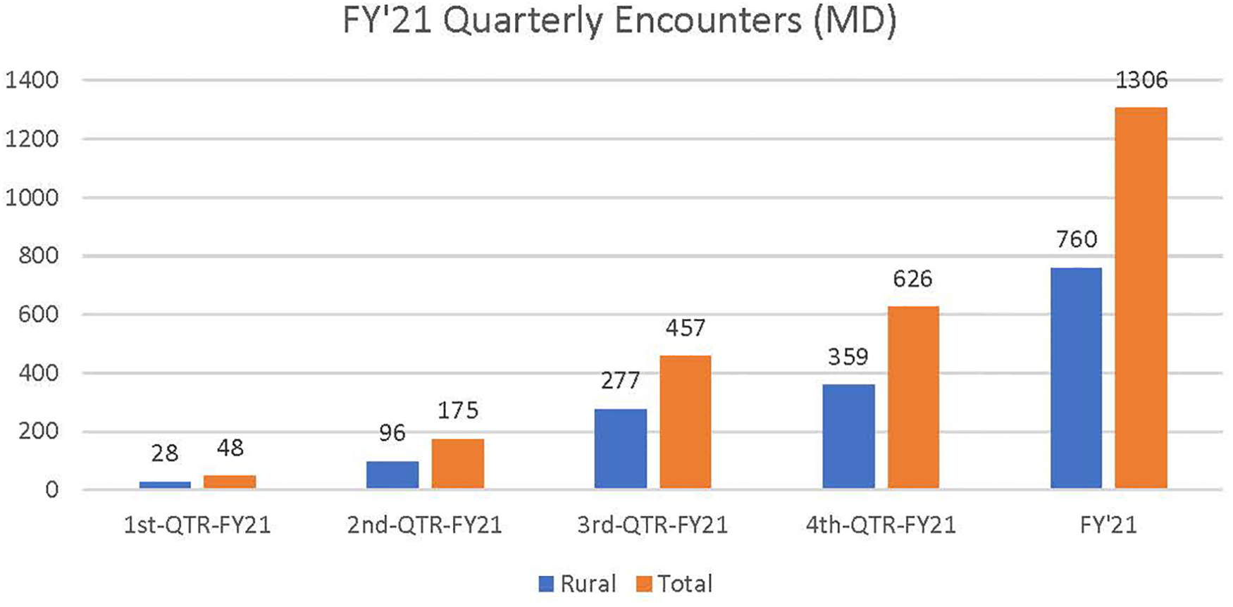 The NTNP maintenance was evident over time as new visits doubled and total encounters increased threefold from FY21 to FY22. Moreover, FY22 growth was significant both in the clinical and the administrative teams with hiring of over 17 Full Time Equivalent Employee (FTEE) to meet the increased demand in services. The NTNP team now includes 20 active neurologists, seven nurses, one social worker, one clinical pharmacy practitioner, four advanced telehealth technicians, a program manager, an administrative officer, a chief technology officer, a senior teleneurologist–consultant, a lead/supervising neurologist, and a medical director.