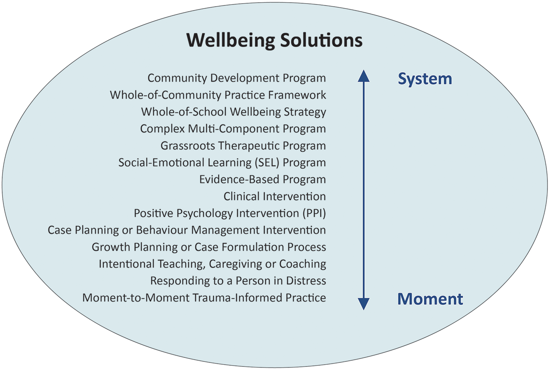 Intentional practice categorises wellbeing solutions as spanning the “system” to the “moment” (see Figure 1). The term “system” is applied to denote a wellbeing solution that brings focus to multiple people or at a community or collective level. System-based wellbeing solutions include whole-of-school approaches and community capacity building initiatives. In contrast, the term “moment” refers to a wellbeing solution or response that is delivered through interactions between two or more people. For example, this may include a parent providing support to a child in distress, or a coaching or counselling intervention. Intentional practice upholds the potential of moment-to-moment interactions or support between two humans, even if it is only brief, to have a powerful effect (positive or negative) on human wellbeing and functioning.