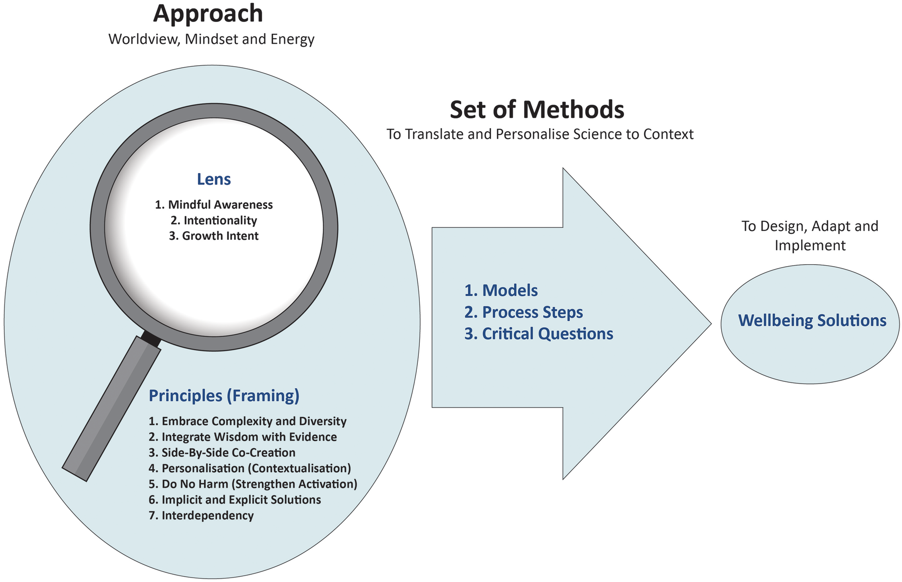 | Approach (principles and lens) | The worldview, mindset and energy brought to the design, adaptation and implementation of wellbeing solutions. |