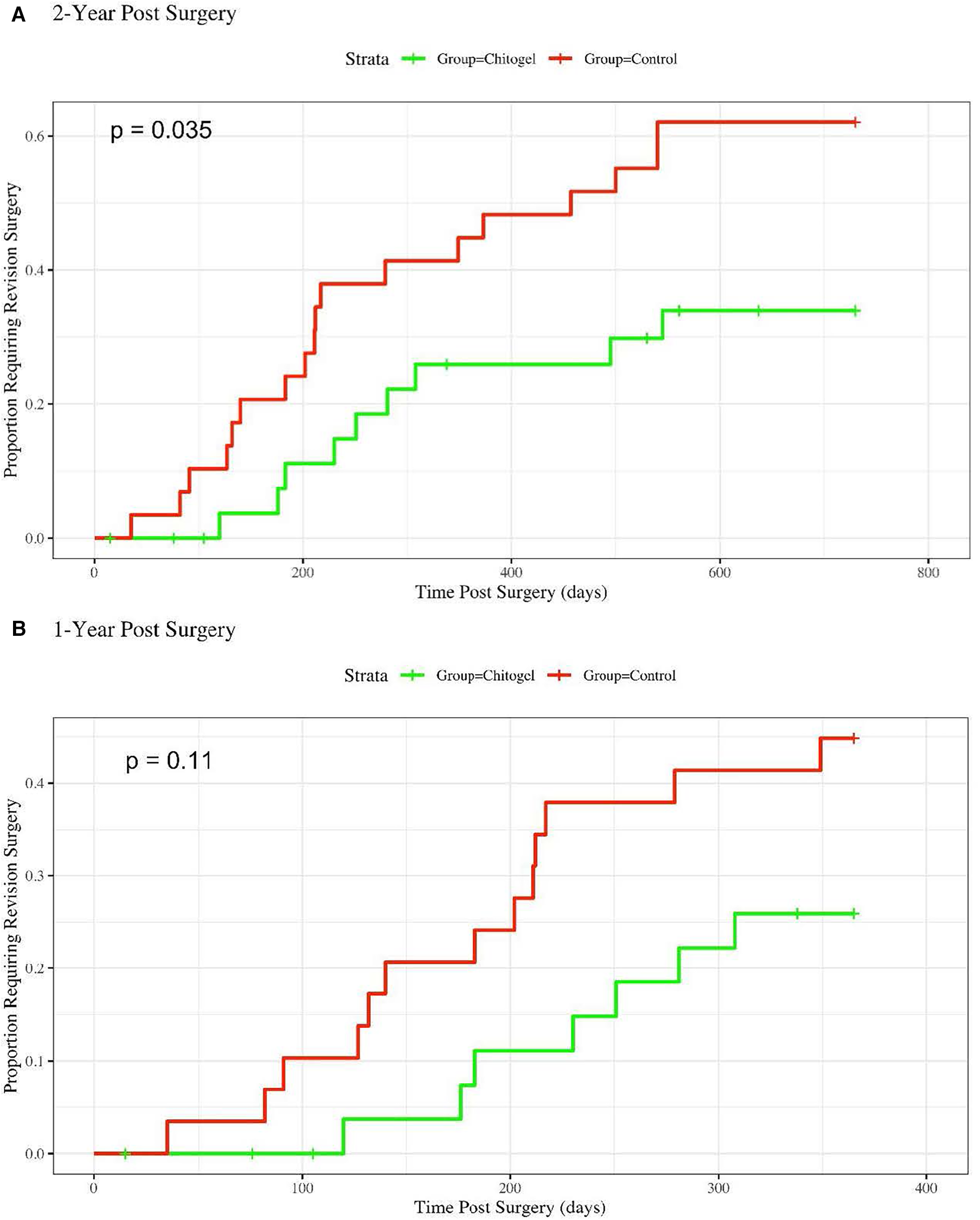 In the control group, 18/29 (62.1%) of patients required revision surgery within 2 years, and 13/29 (44.8%) required revision within 1 year. In the Chitogel treated group, only 9/30 (30.0%) of patients required surgery within 2 years, and 7/30 (23.3%) required revision within one year.