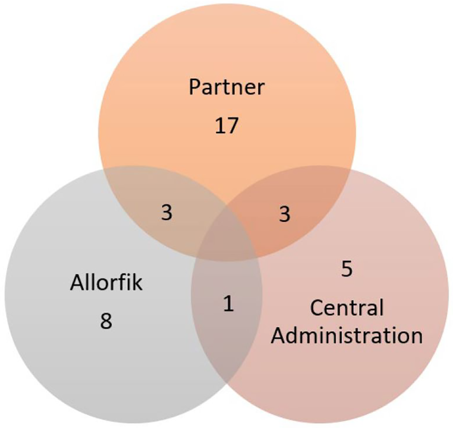 The interviewees’ place of employment. Each circle presents the total number of interviewees who had experience from employment with a partner organization, Allorfik, and central administration and those who had experience from more than one place with the overlaps.
