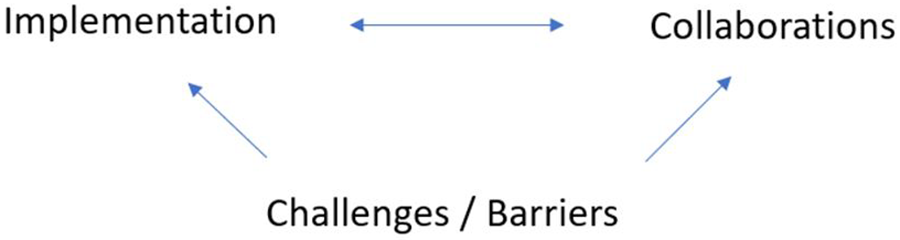 The thematic analysis identified three major themes in the data: the implementation, collaborations, and challenges/barriers and a series of sub-themes. The themes will be elaborated on in the following sections and are very much interlinked as demonstrated in Figure 2.