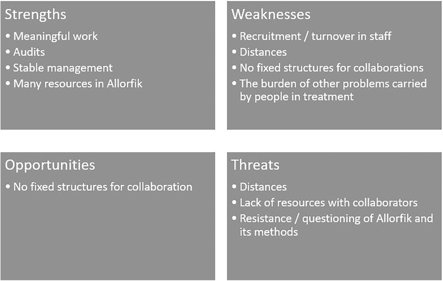 The interviewees from the healthcare system all perceived the collaboration with Allorfik as good, albeit not very close. From the point of view of healthcare professionals, there was not much to collaborate on. One person with a healthcare management position reflected on how the healthcare services have not been great at facilitating collaboration, whereas others highlighted the limited resources in the healthcare systems as an important barrier to do more collaboration. Several informants from the healthcare system would like to be able to refer people from the healthcare system directly to treatment Allorfik to avoid non-appearances or needing to involve the municipalities: