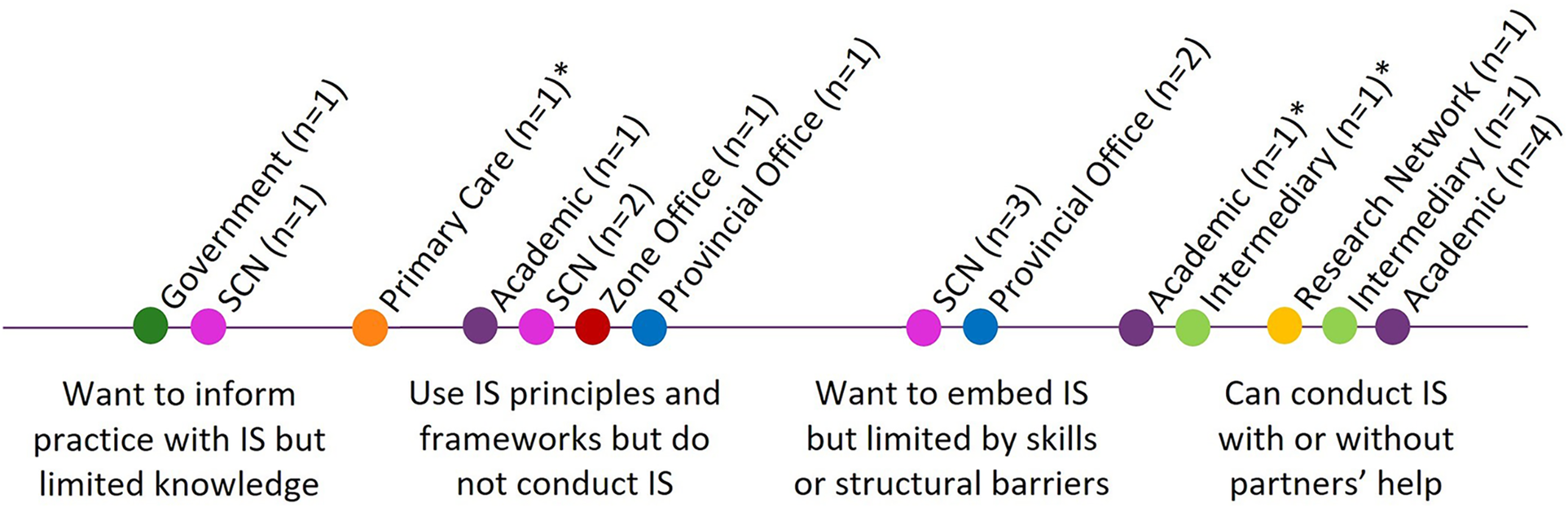 Participant exposure and comfort with IS. The professional categories are color-coded on the spectrum. *Actively working to move into the next category to the right.
