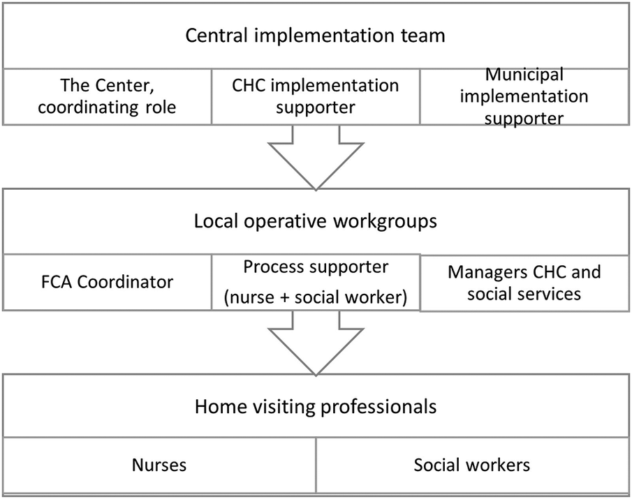 A central implementation team and local operational workgroups were assigned responsibility for managing the implementation. The central implementation support team was coordinated by The Center for Progress in Children's Mental Health (the Center), a unit within Region Västra Götaland tasked with supporting and evaluating the implementation of evidence-based programs for children's mental health. Staff at the Center were responsible for coordination of implementation roles and responsibilities, training and supervision of home visitors, planning for fidelity assurance, and outcome evaluations of the implementation. The first, second and third authors work at the Center and conducted this study as part of a larger planning effort to study the REHV implementation in Gothenburg. Local operational workgroups were established to manage local needs and processes, comprising managers of both CHC and social service agencies, FCA coordinators, and process supporters. The latter were nurses and social workers who would be doing home visits and also have responsibilities for facilitating the implementation process. Process supporter was a new role developed for the REHV initiative to facilitate communication of needs between home visiting staff locally and the central implementation support team, and to facilitate data collection for fidelity monitoring and outcomes evaluations. The structure of implementation support is depicted in Figure 1.