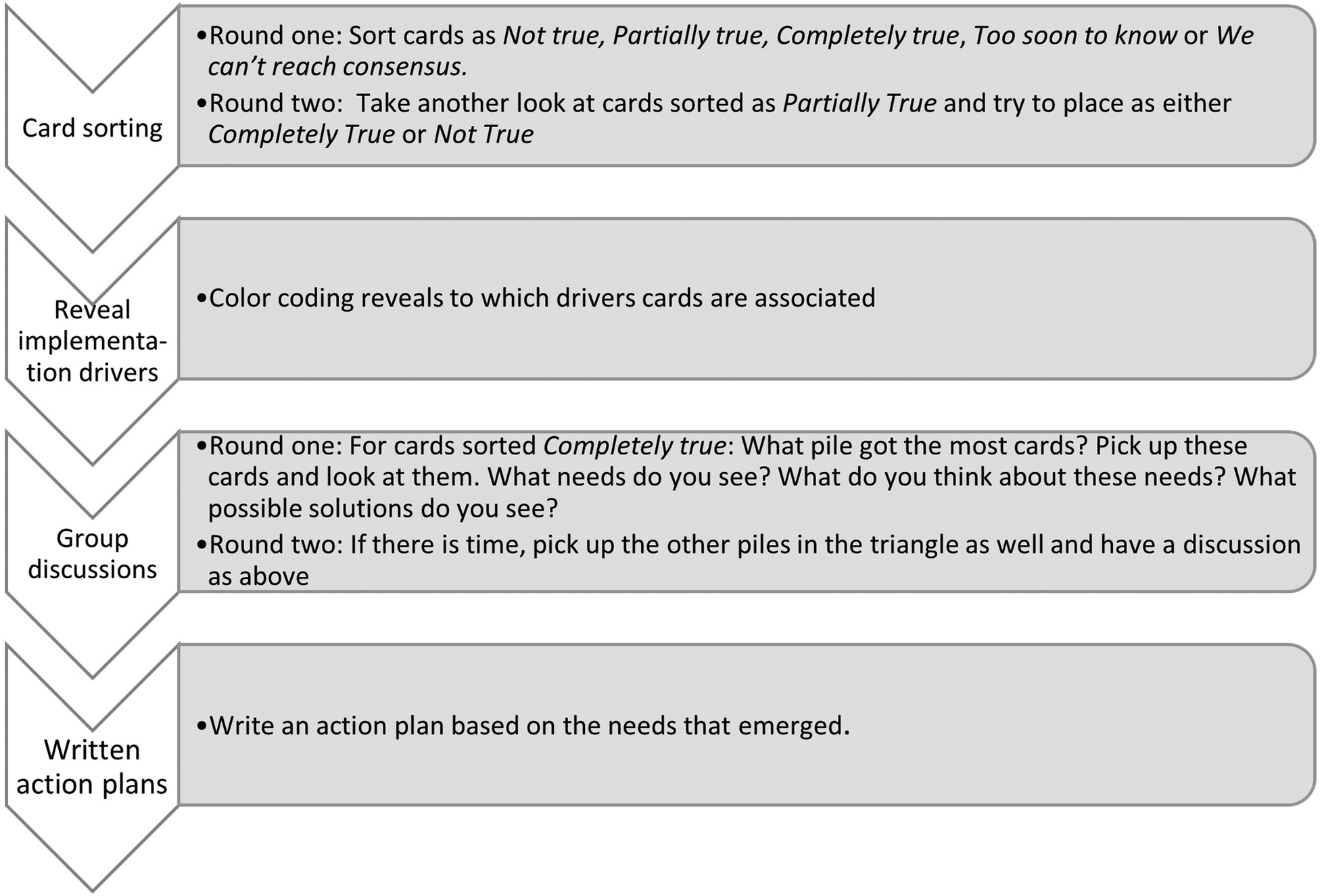 Quantitative results consist of the total number of cards sorted into each response alternative in each of the three categories of implementation drivers. Because so few cards were sorted as Partially true (6 cards, 2%) the decision was made to group these cards as Completely true. Next, the number of cards in each response alternative was divided by 90 (18 cards × 5 groups) yielding three summary scores (Completely true, Not true, and Too soon to know) for each alternative. Cards sorted as either Completely or Partially true by 3 or more groups were initially labeled barriers, and these statements guided step one in the qualitative analysis as shown in Figure 3. Cards sorted Not true were labeled facilitators. Cards sorted as Too soon to know were labeled “Unknowns” and explored further in the qualitative analysis.