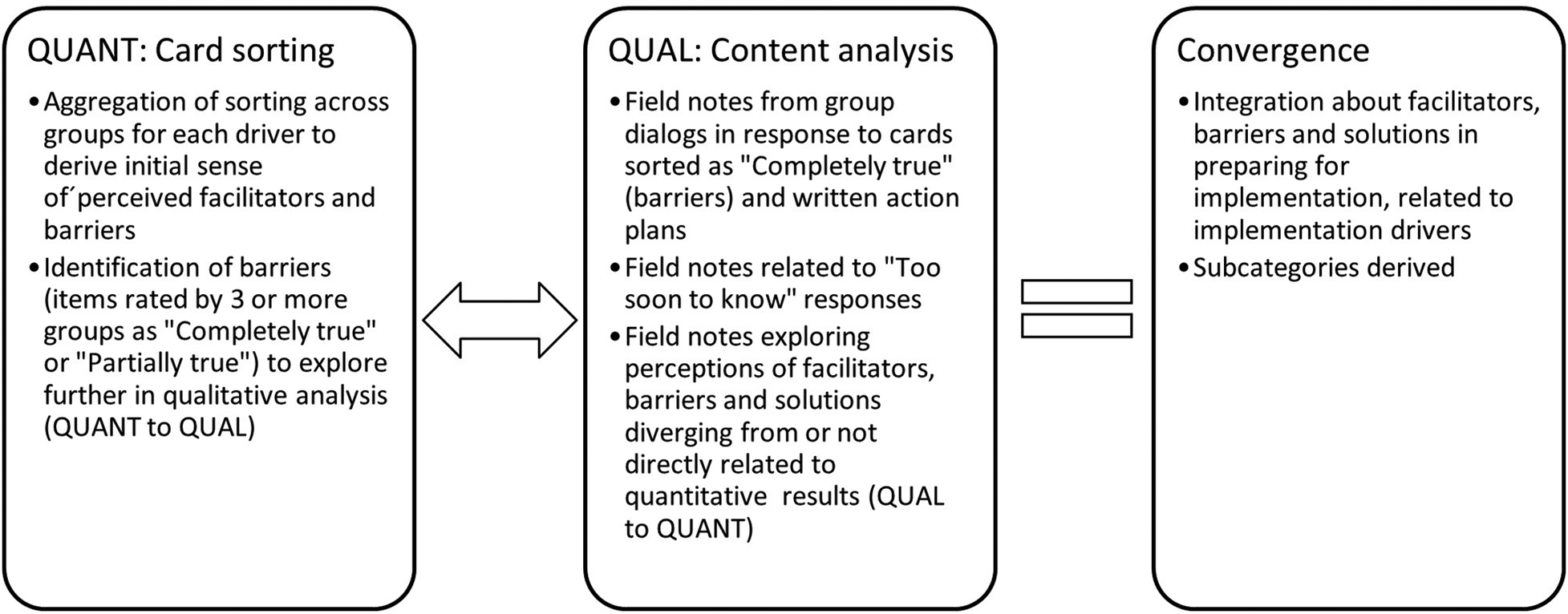 Using a mixed-methods analytical approach (Figure 3), data were analyzed in several steps. Data sets were summarized independently and then integrated by merging them as described by Creswell and Plano Clark (38). Quantitative results from card sorting informed initial areas of exploration in the content analysis, but the content analysis was not limited to results from the card sorting. Qualitative data also served to compliment, expand and deepen the initial understanding of facilitators, barriers and needed solutions related to implementation drivers.