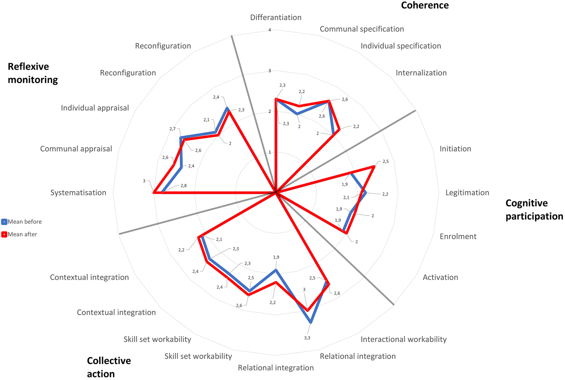 R (version 4.2.2) was used for quantitative analysis. The data had some missing values, and these were imputed with a kNN regression algorithm. Survey items relating to the four NPT mechanisms were analyzed by examining descriptive statistics for each of the four mechanisms. Mechanism scores for each participant were created by taking their average score in each mechanism and dividing by the number of valid responses, which stopped data from being skewed where respondents stated a question was not applicable. Average mechanism scores were reversed (except of the item representing “relational integration”, which was phrased negatively), so that higher scores indicated greater perceived normalization. Higher scores represent better perceived implementation in relation to each mechanism. A Wilcoxon signed-rank test was done to check if two sets of related data are different from each other. These two sets were the variables “Do you consider Endre to be an integral part of your current day-to-day work?” and “Do you consider that Endre will become an integral part of your day-to-day work?”. A significant difference between the two items was seen as indicative that the use of Endre might become a more normal part of professionals’ work in the future.