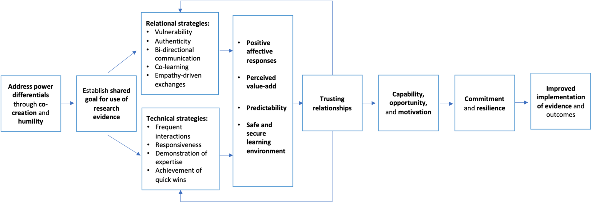 Theoretical model of how to build trusting relationships to support implementation and evidence use. Figure adapted with permission from Metz, Jensen, Farley, Boas, Bartley & Villodas (2022).