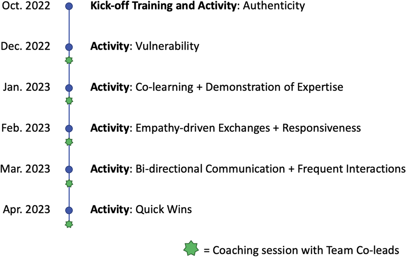 Starting in October 2022, we delivered a kick-off training and activity that was 1.5 h in duration. This module focused on authenticity as a relational strategy and provided participants with an overview of the full training and coaching approach. The remaining modules, delivered monthly between December 2022 and April 2023, were each 30–45 min in duration and embedded within existing team meetings. Our intention was to reduce participant burden as much as possible and remove barriers to participant engagement. The December 2022 module focused on vulnerability; the January 2023 module focused on co-learning and demonstration of expertise; the February 2023 module focused on empathy-driven exchanges and responsiveness; the March 2023 module focused on bi-directional communication and frequent interactions; and the April 2023 module focused on quick wins. All modules were delivered remotely via the Zoom web-conferencing platform.