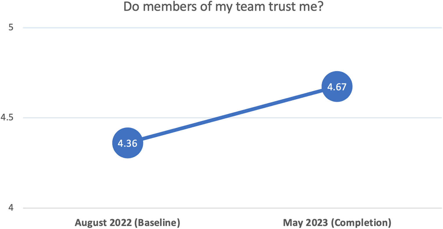 In terms of RQ3, Figure 3 shows average scores estimated from 8 items that measured participants' perceptions that they were trusted by their team, with values ranging from a low of 1 to a high of 5. On average, participants reported significant increases over time in their perceptions that they were trusted by their team. Holding model covariates at sample-mean levels, the average rate-of-change from baseline (4.36) to completion (4.67) was 0.31 units (significant at p < .05); however, this value varied significantly across participants (i.e., significant random effect), such that one standard deviation (SD) below and above the average rate-of-change included the following range of values: −0.06 to 0.69. Thus, for some participants the rate-of-change was notably higher than average, whereas for others it was near 0. The figure simply captures the average rate-of-change in the sample.