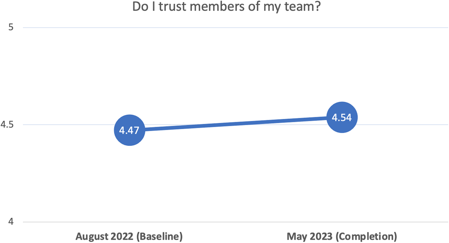 Visualization of change over time in perceptions of team trust in self. Outcome values range from 1 to 5.