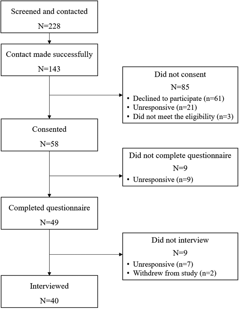 A bilingual native-speaking (Spanish/English) research assistant contacted 143 individuals through convenience sampling. A total of 58 individuals consented to participate (n = 61 declined, n = 21 were unresponsive to follow-up, and n = 3 did not meet the full study inclusion criteria). Of these, 49 individuals completed a study questionnaire in the days prior to their telephone interview. Seven participants completed the questionnaire but could not be reached for an interview after two contact attempts. Two participants withdrew from the study (one was voluntary withdrawal and the other was ineligible). The participants were sent a $20 gift card electronically or by mail following the completion of the questionnaire. An additional $20 gift card was sent to those who completed the interviews, for a total of up to $40 each.