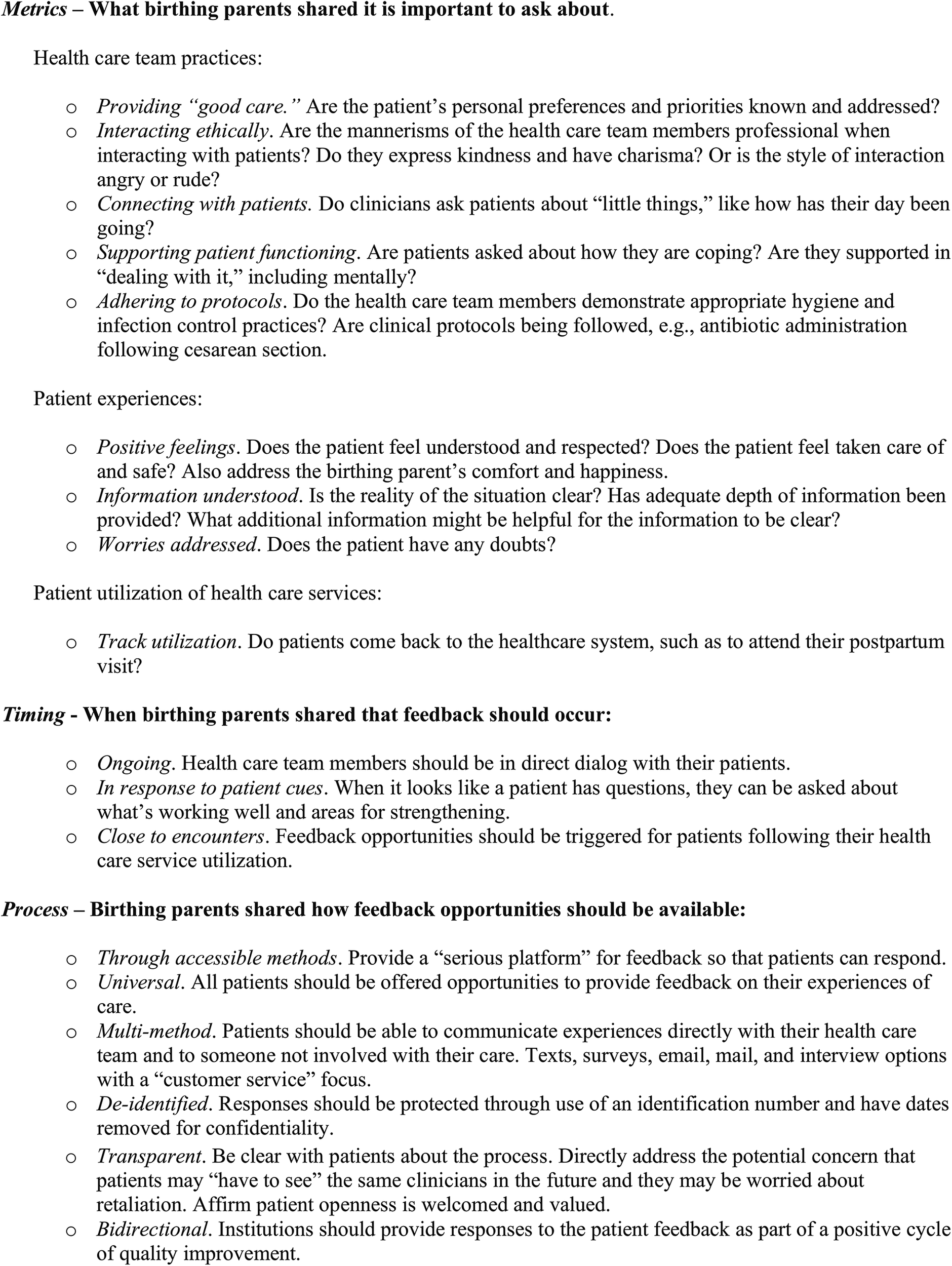 Forty birthing parents participated in the study. Metrics, timing, and process were identified as important components of meaningfully measuring the quality of perinatal care. Recommended metrics included asking patients whether their health priorities were addressed. Additional metrics of importance were whether coping strategies were provided, the clarity of information provided, patient comprehension of health information, the extent to which care planning was collaborative among patients and their healthcare team members, whether clinicians alleviated patient doubts, patient feelings of being taken care of, healthcare team mannerisms, clinician demonstrations of respect for patient autonomy, and postpartum visit attendance. With regard to timing, patients desired that their healthcare team members “check-in” with them as part of an ongoing, direct dialog. Birthing parents also wanted opportunities to provide feedback soon after encounters. As part of a robust measurement process, they wanted to share their insights with someone who was not a part of their healthcare team, for maintaining confidentiality. The patients desired a “serious platform” with accessible methods for all birthing parents to be able to convey nuanced accounts of their care. They also wanted to hear from the healthcare institutions about their feedback. Birthing parents sought assurances for their perinatal care feedback to be de-identified to protect them from potential retaliation. The participants recognized that they might need to utilize healthcare services from the same institution and individuals in the future.