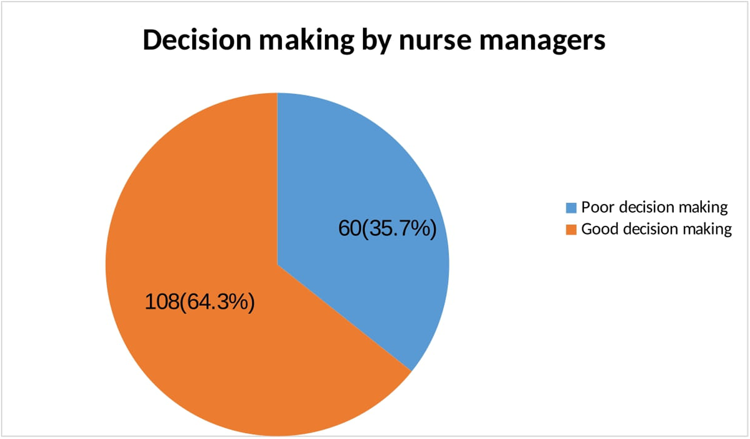 In this study finding, 60 (35.7%) with a 95% CI [28.1, 43.5] of the study participants had poor decision-making. However, nearly two-thirds of nurse managers reported good decision-making (Figure 1).