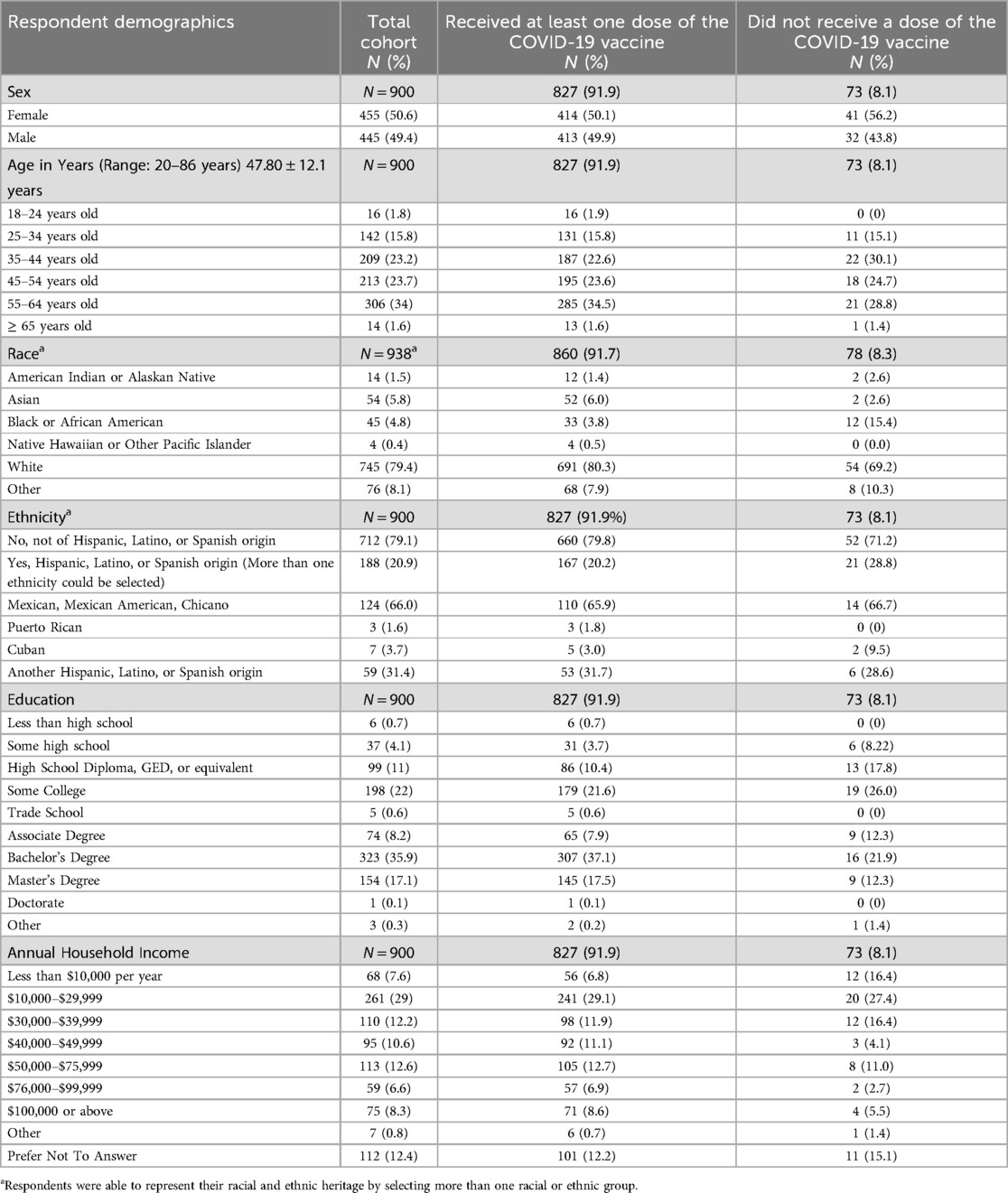 Of the 5,806 members invited to participate in this study, 900 (15.5%) submitted a complete survey. The response rate is consistent with head-of-household survey response rates for other Sendero population health research initiatives (3, 11). Females represented 50.6% (n = 455) of respondents. The average age of respondents was 47.8 years, with a standard deviation of ±12.1 years. Individuals who identified as White represented 745 (79.4%) respondents, while individuals who self-identified as Asian and Black or African American represented 54 (5.8%) and 45 (4.8%) respondents, respectively. About one-fifth of respondents (20.9%; n = 188) self-identified as Hispanic, Latino, or of Spanish origin. The majority of respondents (53.1%; n = 478) reported having obtained at least a bachelor degree. Eleven percent (n = 99) reported obtaining a high school degree or equivalent. Of the 900 respondents, 781 (86.8%) provided information on their annual household income range, the majority of whom reported a household income of less than USD $40,000 (56.2%; n = 439). Table 1 reports the demographic and summary characteristics of survey respondents.
