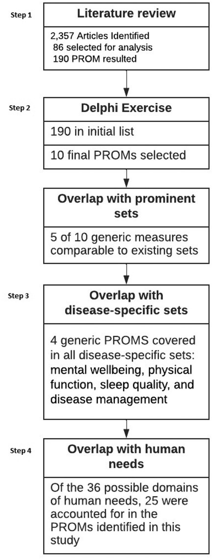 Flowchart depicting the process of selecting Patient-Reported Outcome Measures (PROMs). Step 1: Literature review with 2,357 articles identified, 86 analyzed, resulting in 190 PROMs. Step 2: Delphi Exercise narrowed to 10 final PROMs. Step 3: Overlap with disease-specific sets; 4 generic PROMs covered areas like mental wellbeing and sleep quality. Step 4: Overlap with human needs, accounting for 25 of 36 possible domains.