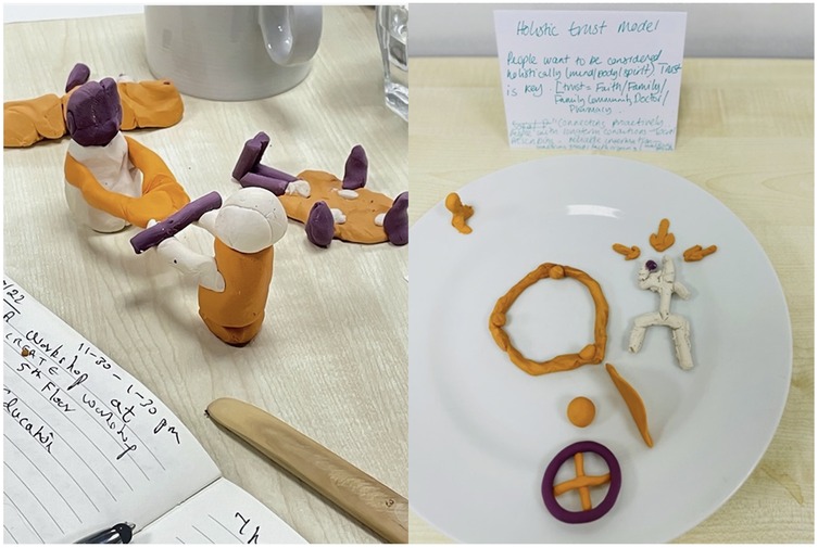 The co-design workshop participants were purposively sampled from relevant communities, charities, health and social care and policy sectors, as well as including researchers and some research participants. The inclusion criterion was that they had to have professional or personal expertise in or experience of health and social care for people from minoritised ethnic backgrounds with disabilities. This gave them the necessary practical understanding of how services are commissioned, developed and/or deployed, so they could identify gaps or possibilities for change. We successfully recruited 12–16 people for each of our two co-design workshops, in June and July 2022; the same people could not necessarily attend them both. Attendees were four charity leads, two social workers, three community leads, two patients, three clinicians, two service managers. Their roles were represented by coloured dots on badges they wore in the sessions, rather than words. This meant that power differentials were not obvious, but the central team could ensure each “breakout table” had a mix of 6–8 people with different types of experience. Each table had a CICADA team facilitator from among PAG members, co-researchers and the central team. They were given illustrative quotes from the data to consider, with examples of coping strategies highlighted within contextual information. Short descriptions of the themes were read out to them, and they were then asked to create a plasticine model to represent a relevant coping strategy from the data (Figure 1). The activity of physical modelling facilitated ideas generation and helped people think differently about problems.