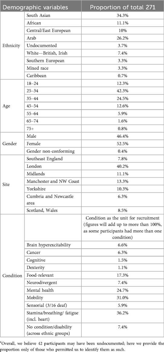 The qualitative data strand of CICADA was originally designed to be fully inclusive of all minoritised ethnic groups living with any disabling impairments in England. We recognised that, because of multiple intersecting identities, it was problematic to categorise people more specifically. This approach did not, however, fit well within existing health research paradigms, nor with funder peer reviewers and the funding panel, who rejected the first CICADA funding application. They specified the study needed a redesign to focus on a few specific categories of people. Consequently, the study lead (CR) selected four cultural groups, chosen to represent those with the highest UK COVID-19 mortality rates according to 2020 data (16), and the most recent migration waves to England (17). These under-represented groups were selected on the basis that they, or their parents, were born in Arab (Middle Eastern and North African), South Asian, African or Central/East European countries. We aimed to encompass all levels of citizenship status, from undocumented to British. Study participants could self-define disability and undiagnosed conditions, thus ensuring we included conditions that typically take years to be diagnosed. The lead then grouped the different self-descriptions to match the UK Government Statistical Service harmonised data recommendations. These categories were not always intuitive but enabled us to produce analyses that “spoke” to policy. We added further categories as the study progressed. See Table 1 for the full list. For comparisons we included people of White British heritage and non-disabled people across all ethnic groups, using purposive quota sampling across all categories to aim for 5–7 participants from each combination of impairment group and ethnicity category (including comparators). Participants who completed interviews by December 2022 were invited to join our subsequent knowledge exchange workshops.