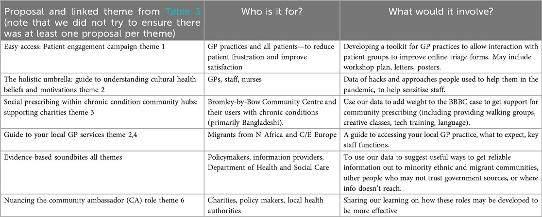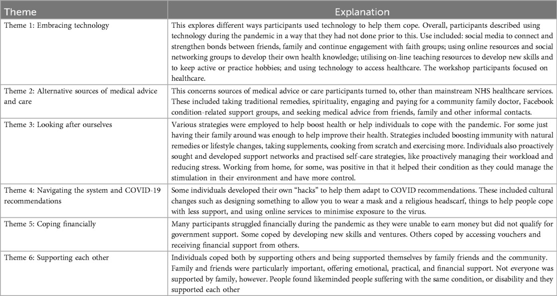 We had to make some compromises in the methods used. Conducted during the COVID-19 pandemic, the study had to adapt in real-time, switching between remote work through online platforms and face-to-face work. The use of community co-researchers from various ethnic minority groups and at various levels of socioeconomic status was pioneering in healthcare research at the time, enabling greater inclusion and deeper insights from under-represented groups. Nonetheless, in an 18-month study, there were some constraints on how much they could be involved in a full analysis of the data, compared for example with a more recent study by some team members (52). We therefore had to be creative in the way we involved participants in data interpretation, through our knowledge exchange workshops.