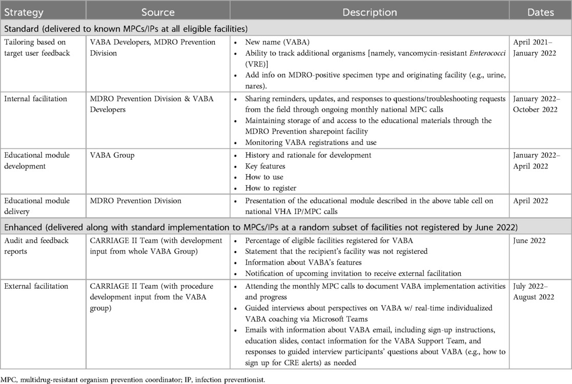 Implementation strategies are described in detail in Table 1. Standard strategies included: (1) tailoring of VABA to include new features based on target end-user feedback, (2) development and delivery of a VABA educational module to target users, and (3) ongoing internal facilitation by the MDRO Prevention Division. Enhanced implementation strategies included standard strategies plus: (1) audit and feedback reports on VABA registration (see Supplementary Figure S1) and (2) external facilitation from members of the CARRIAGE II team.