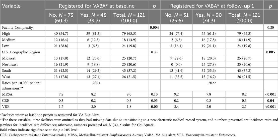 Exclusions and participation in each component of standard and enhanced are displayed in Figure 1. Characteristics of 121 VABA-eligible facilities were compared by registration status at baseline and after standard implementation in Table 2. At baseline, facilities that were registered were higher complexity (p-value = 0.004) and had higher rates of VRE cases per 10,000 patients (p-value = 0.03) than those that were not registered. At Follow-up 1, there were significant geographic differences (p = 0.005) such that no unregistered facilities were from the Northeast, and unregistered facilities were more commonly from the South and West. Fiscal year 2022 MRSA and VRE rates were lower among facilities that had registered at Follow-up 1 (p-value < 0.001 for both) than those that had not, while CRE rates were higher (p-value = 0.04). The adoption rate was 40% at baseline and 75% at Follow-up 1. (p-value < 0.0001).